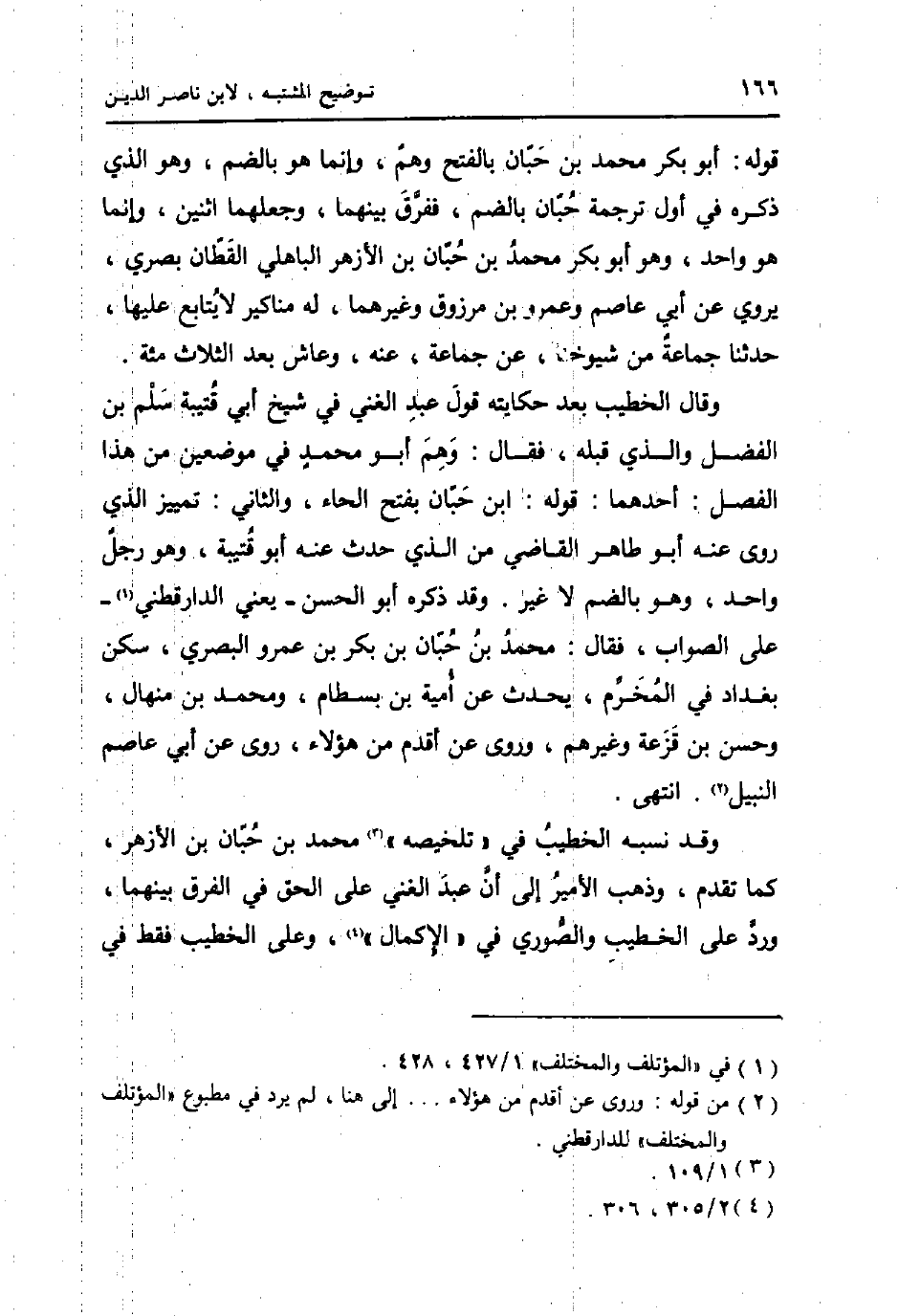 وَقَالَ الْخَطِيب بعد حكايته قَول عبد الْغَنِيّ فِي شيخ أبي قُتَيْبَة سلم بن الْفضل وَالَّذِي قبله، فَقَالَ: وهم أَبُو مُحَمَّد فِي موضِعين من هَذَا الْفَصْل: أَحدهمَا: قَوْله: ابْن حبَان بِفَتْح الْحَاء، وَالثَّانِي: تَمْيِيز الَّذِي روى عَنهُ أَبُو طَاهِر القَاضِي من الَّذِي حدث عَنهُ أَبُو قُتَيْبَة، وَهُوَ رجل وَاحِد وَهُوَ بِالضَّمِّ لَا غير. وَقد ذكره أَبُو الْحسن - يَعْنِي الدَّارَقُطْنِيّ - على الصَّوَاب، فَقَالَ: مُحَمَّد بن حبَان بن بكر بن عَمْرو الْبَصْرِيّ، سكن بَغْدَاد فِي المخرم، يحدث عَن أُميَّة بن بسطَام، وَمُحَمّد بن منهال، وَحسن بن قزعة وَغَيرهم، وروى عَن اقدم من هَؤُلَاءِ، روى عَن أبي عَاصِم النَّبِيل. انْتهى.
