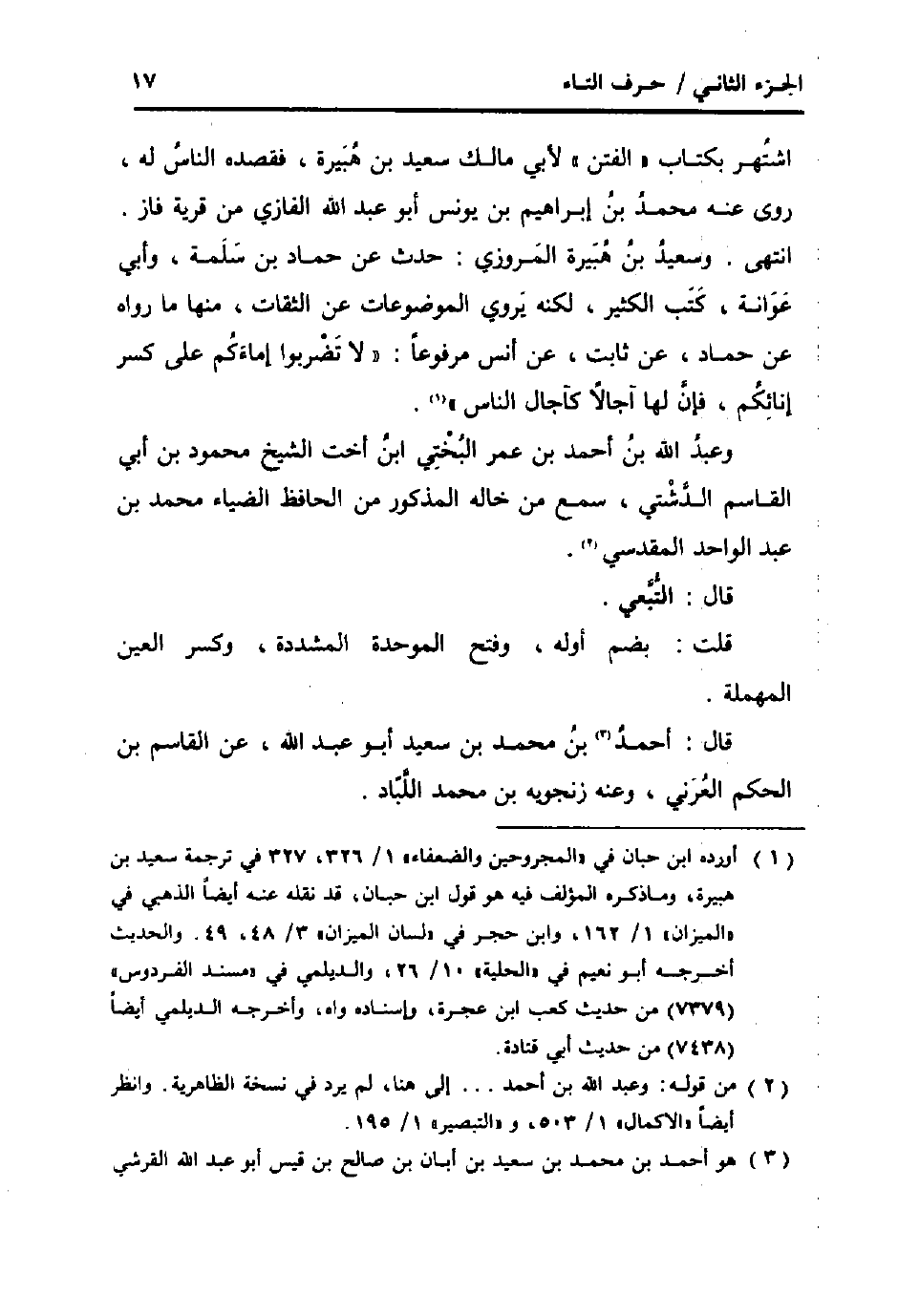 اشْتهر بِكِتَاب " الْفِتَن " لأبي مَالك سعيد بن هُبَيْرَة، فقصده النَّاس لَهُ، روى عَنهُ مُحَمَّد بن إِبْرَاهِيم بن يُونُس أَبُو عبد الله الفازي من قَرْيَة فَازَ، انْتهى. وَسَعِيد بن هُبَيْرَة الْمروزِي: حدث عَن حَمَّاد بن سَلمَة، وابي عوَانَة، كتب الْكثير، لكنه يروي الموضوعات عَن الثِّقَات، مِنْهَا مَا رَوَاهُ عَن حَمَّاد، عَن ثَابت، عَن أنس مَرْفُوعا: " لَا تضربوا إماءكم على كسر إنائكم، فَإِن لَهَا آجالا كآجال النَّاس ".