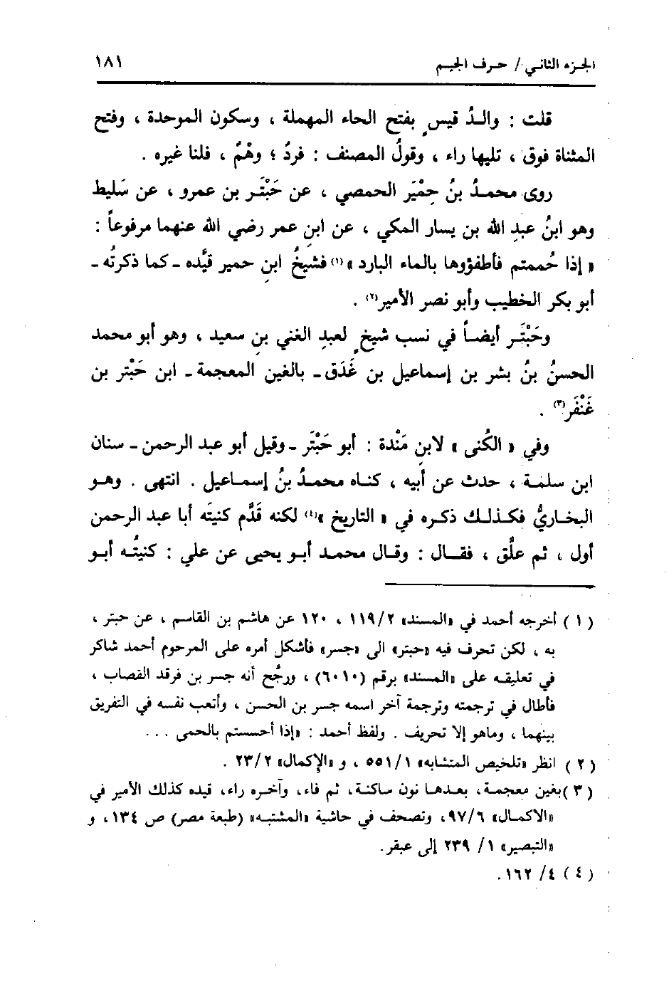 روى مُحَمَّد بن حمير الْحِمصِي، عَن حبتر بن عَمْرو، عَن سليط وَهُوَ ابْن عبد الله بن يسَار الْمَكِّيّ، عَن ابْن عمر رَضِي الله عَنْهُمَا مَرْفُوعا: " إِذا حممتم فأطفؤوها بِالْمَاءِ الْبَارِد " فَشَيْخ ابْن حمير قَيده - كَمَا ذكرته - أَبُو بكر الْخَطِيب وَأَبُو نصر الْأَمِير.