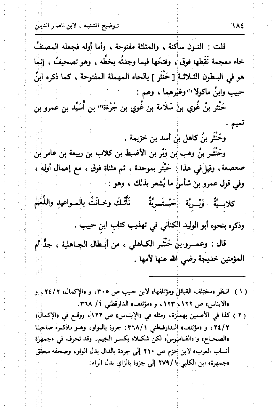 قلت: النُّون سَاكِنة، والمثلثة مَفْتُوحَة، وَأما أَوله فَجعله المُصَنّف خاء مُعْجمَة نقطها فَوق، وَفتحهَا فِيمَا وجدته بِخَطِّهِ، وَهُوَ تَصْحِيف، إِنَّمَا هُوَ فِي الْبُطُون الثَّلَاثَة [حنثر] بِالْحَاء الْمُهْملَة الْمَفْتُوحَة، كَمَا ذكره ابْن حبيب وَابْن مَاكُولَا وَغَيرهمَا، وهم: