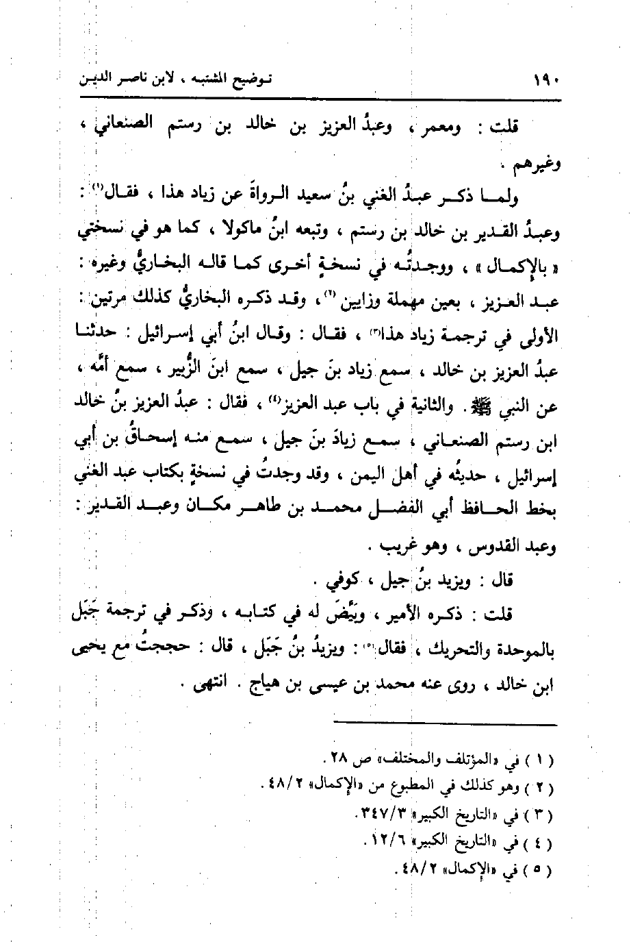 قلت: وَمعمر، وَعبد الْعَزِيز بن خَالِد بن رستم الصَّنْعَانِيّ، وَغَيرهم. وَلما ذكر عبد الْغَنِيّ بن سعيد الروَاة عَن زِيَاد هَذَا، فَقَالَ: وَعبد الْقَدِير بن خَالِد بن رستم، وَتَبعهُ ابْن مَاكُولَا، كَمَا هُوَ فِي نُسْخَتي " بالإكمال "، وَوَجَدته فِي نُسْخَة أُخْرَى كَمَا قَالَه البُخَارِيّ وَغَيره: عبد الْعَزِيز، بِعَين مُهْملَة وزايين، وَقد ذكره البُخَارِيّ كَذَلِك مرَّتَيْنِ: الأولى فِي تَرْجَمَة زِيَاد هَذَا، فَقَالَ: وَقَالَ ابْن أبي إِسْرَائِيل: حَدثنَا عبد الْعَزِيز بن خَالِد، سمع زِيَاد بن جيل، سمع ابْن الزبير، سمع امهِ، عَن النَّبِي صلى الله عَلَيْهِ وَسلم. وَالثَّانيَِة فِي بَاب عبد الْعَزِيز، فَقَالَ: عبد الْعَزِيز بن خَالِد ابْن رستم الصَّنْعَانِيّ، سمع زِيَاد بن جيل، سمع مِنْهُ إِسْحَاق بن أبي اسرائيل، حَدِيثه فِي أهل الْيمن، وَقد وجدت فِي نسخه بِكِتَاب عبد الْغَنِيّ بِخَط الْحَافِظ أبي الْفضل مُحَمَّد بن طَاهِر مَكَان وَعبد الْقَدِير: وَعبد القدوس، وَهُوَ غَرِيب.
