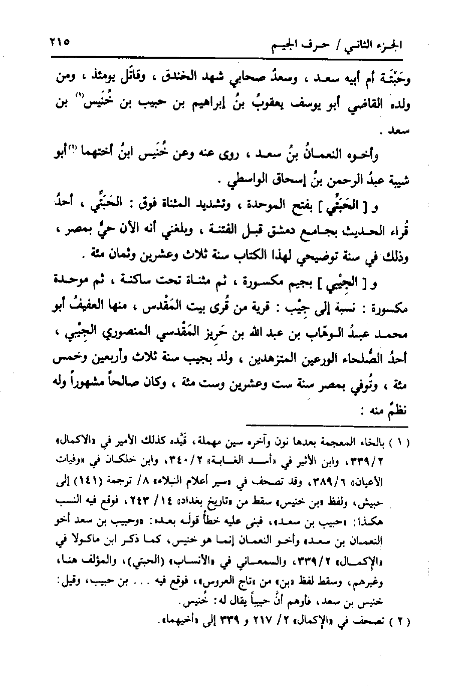 و [الحَبَتِّي] بِفَتْح الْمُوَحدَة، وَتَشْديد الْمُثَنَّاة فَوق: الحبتي، أحد قراء الحَدِيث بِجَامِع دمشق قبل الْفِتْنَة، وَبَلغنِي انه الْآن حَيّ بِمصْر، وَذَلِكَ فِي سنة توضيحي لهَذَا الْكتاب سنة ثَلَاث وَعشْرين وثمان مئة. و [الجِيْبي] بجيم مَكْسُورَة، ثمَّ مثناة تَحت سَاكِنة، ثمَّ مُوَحدَة مَكْسُورَة: نِسْبَة إِلَى جيب: قَرْيَة من قرى بَيت الْمُقَدّس، مِنْهَا الْعَفِيف أَبُو مُحَمَّد عبد الْوَهَّاب بن عبد الله بن حريز الْمَقْدِسِي المنصوري الجيبي، أحد الصلحاء الورعين المتزهدين، ولد بجيب سنة ثَلَاث واربعين وَخمْس مئة، وَتُوفِّي بِمصْر سنة سِتّ وَعشْرين وست مئة، وَكَانَ صَالحا مَشْهُورا وَله نظم مِنْهُ: