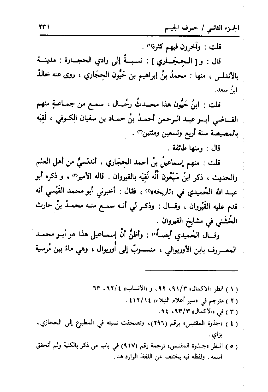 قلت: مِنْهُم إِسْمَاعِيل بن أَحْمد الحجاري، أندلسي من أهل الْعلم والْحَدِيث، ذكر ابْن سَبْعُونَ انه لقِيه بالقيروان. قَالَه الْأَمِير، وَذكره أَبُو عبد الله الْحميدِي فِي " تَارِيخه "، فَقَالَ: اخبرني أَبُو مُحَمَّد الْقَيْسِي انه قدم عَلَيْهِ القيروان، وَقَالَ: وَذكر لي انه سمع مِنْهُ مُحَمَّد بن حَارِث الْخُشَنِي فِي مَشَايِخ القيروان.