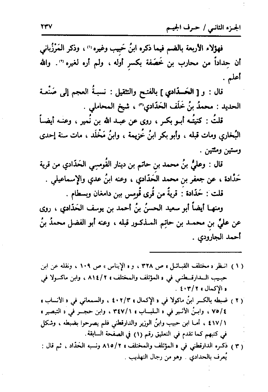 فَهَؤُلَاءِ الْأَرْبَعَة بِالضَّمِّ فِيمَا ذكره ابْن حبيب وَغَيره، وَذكر المرزباني أَن حدادا من محَارب بن خصفة بِكَسْر اوله، وَلم أره لغيره. وَالله اعْلَم.