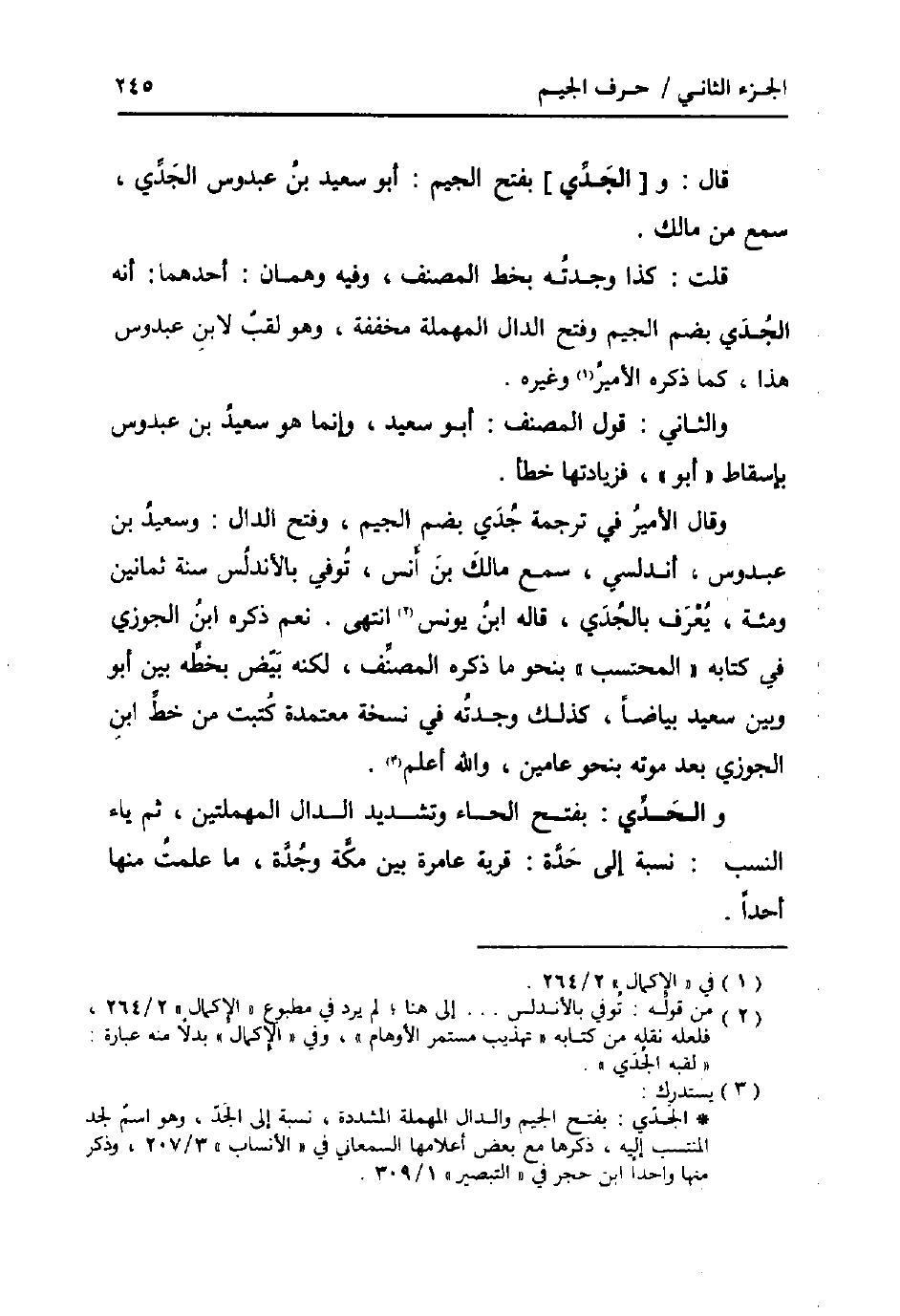 وَقَالَ: الْأَمِير فِي تَرْجَمَة جدي بِضَم الْجِيم، وَفتح الدَّال: وَسَعِيد بن عَبدُوس، اندلسي، سمع مَالك بن انس، توفّي بالاندلس سنة ثَمَانِينَ ومئة، يعرف بالجدي، قَالَه ابْن يُونُس انْتهى. نعم ذكره ابْن الْجَوْزِيّ فِي كِتَابه " الْمُحْتَسب " بِنَحْوِ مَا ذكره المُصَنّف، لكنه بيض بِخَطِّهِ بَين أَبُو وَبَين سعيد بَيَاضًا، كَذَلِك وجدته فِي نُسْخَة مُعْتَمدَة كتبت من خطّ ابْن الْجَوْزِيّ بعد مَوته بِنَحْوِ عَاميْنِ، وَالله أعلم.