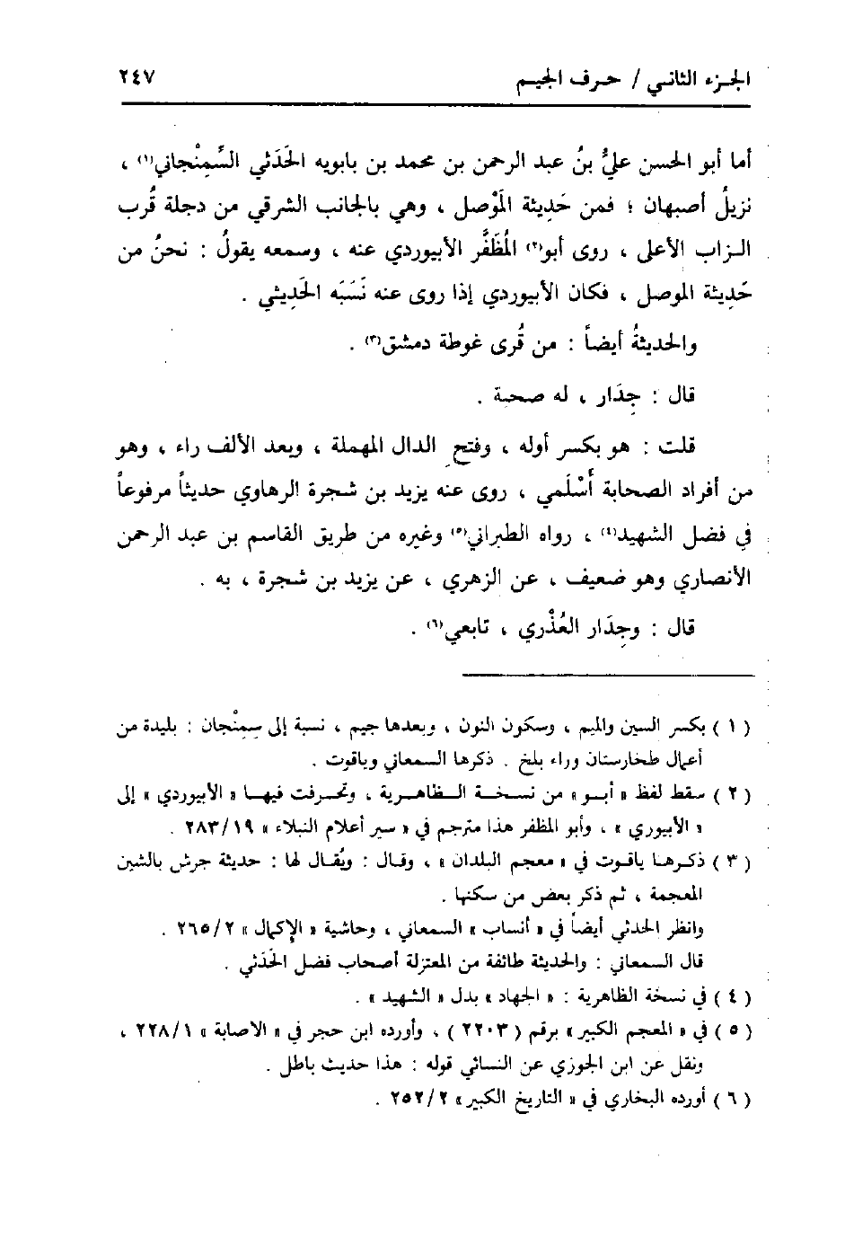 أما أَبُو الْحسن عَليّ بن عبد الرَّحْمَن بن مُحَمَّد بن بابويه الحدثي السمنجاني، نزيل أَصْبَهَان، فَمن حَدِيثه الْموصل، وَهِي بالجانب الشَّرْقِي من دجلة قرب الزاب الاعلى، روى أَبُو المظفر الابيوردي عَنهُ، وسَمعه يَقُول: نَحن من حَدِيثَة الْموصل، فَكَانَ الابيوردي إِذا روى عَنهُ نسبه الحديثي.