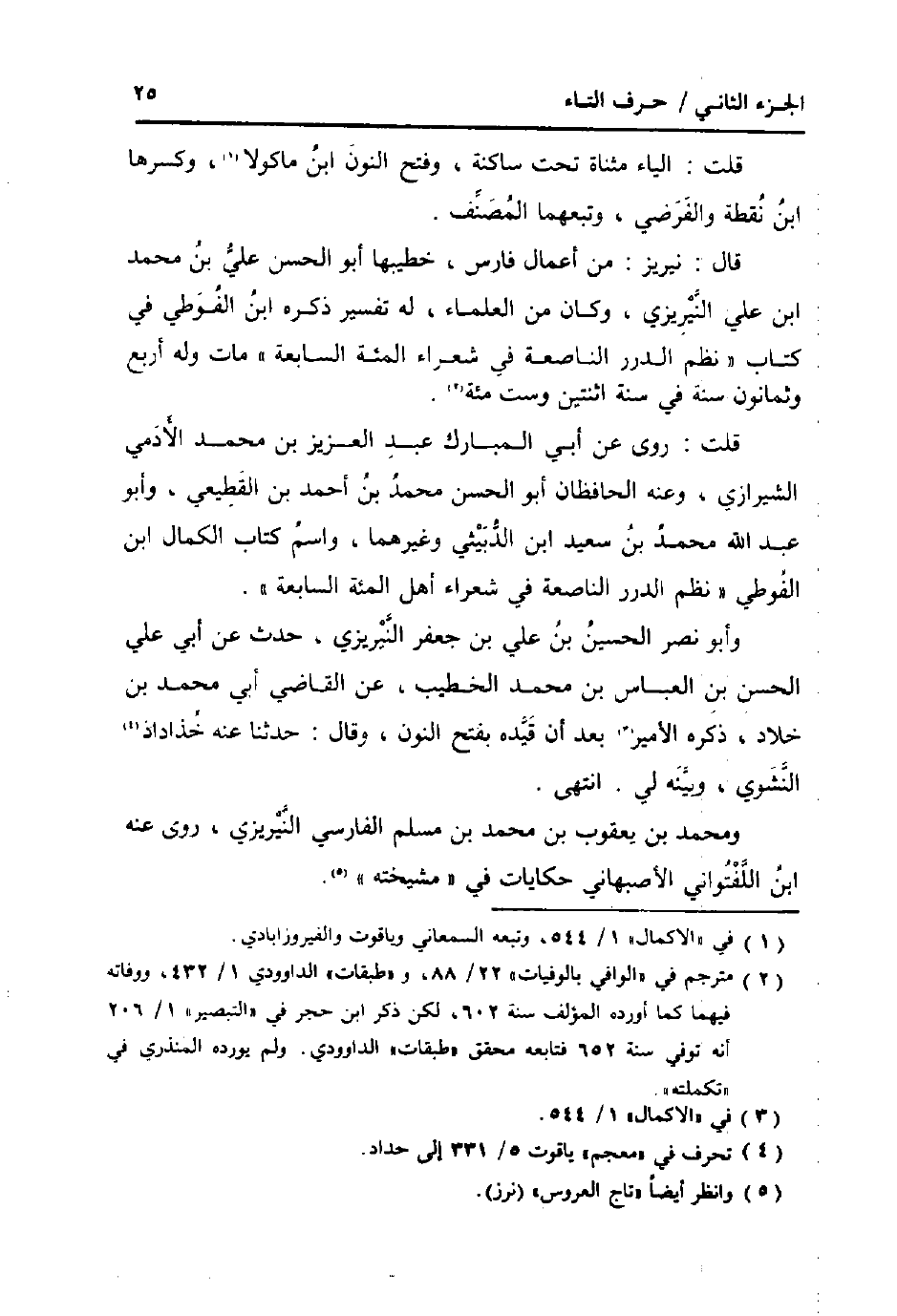 قَالَ: نيريز: من أَعمال فَارس، خطيبها أَبُو الْحسن عَليّ بن مُحَمَّد ابْن عَليّ النيريزي، وَكَانَ من الْعلمَاء، لَهُ تَفْسِير ذكره ابْن الفوطي فِي كتاب " نظم الدُّرَر الناصعة فِي شعراء المئة السَّابِعَة " مَاتَ وَله أَربع وَثَمَانُونَ سنة فِي سنة اثْنَتَيْنِ وست مئة.