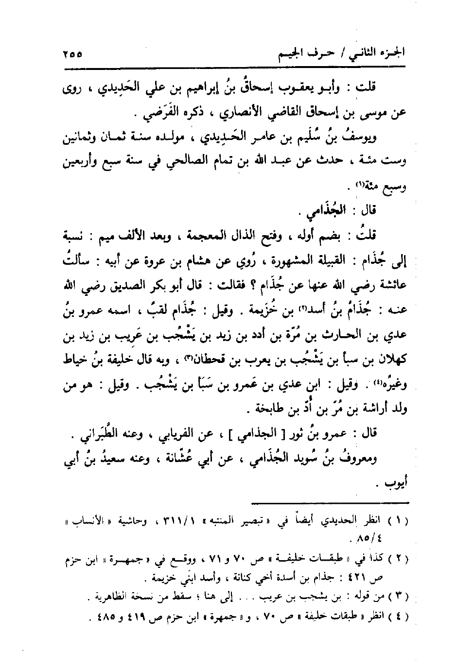 قلت: بِضَم اوله، وَفتح الذَّال الْمُعْجَمَة، وَبعد الْألف مِيم: نِسْبَة إِلَى جذام: الْقَبِيلَة الْمَشْهُورَة، رُوِيَ عَن هِشَام بن عُرْوَة عَن أَبِيه: سَالَتْ عَائِشَة رَضِي الله عَنْهَا عَن جذام؟ فَقَالَت: قَالَ أَبُو بكر الصّديق رَضِي الله عَنهُ: جذام بن أَسد بن خُزَيْمَة. وَقيل: جذام لقب، اسْمه عَمْرو بن عدي بن الْحَارِث بن مرّة بن أدد بن زيد بن يشجب بن عريب بن زيد بن كهلان بن سبأ بن يشجب بن يعرب بن قحطان، وَبِه قَالَ خَليفَة بن خياط وَغَيره. وَقيل: ابْن عدي بن عَمْرو بن سبأ بن يشجب. وَقيل: هُوَ من ولد اراشة بن مر بن ادَّ بن طابخة.