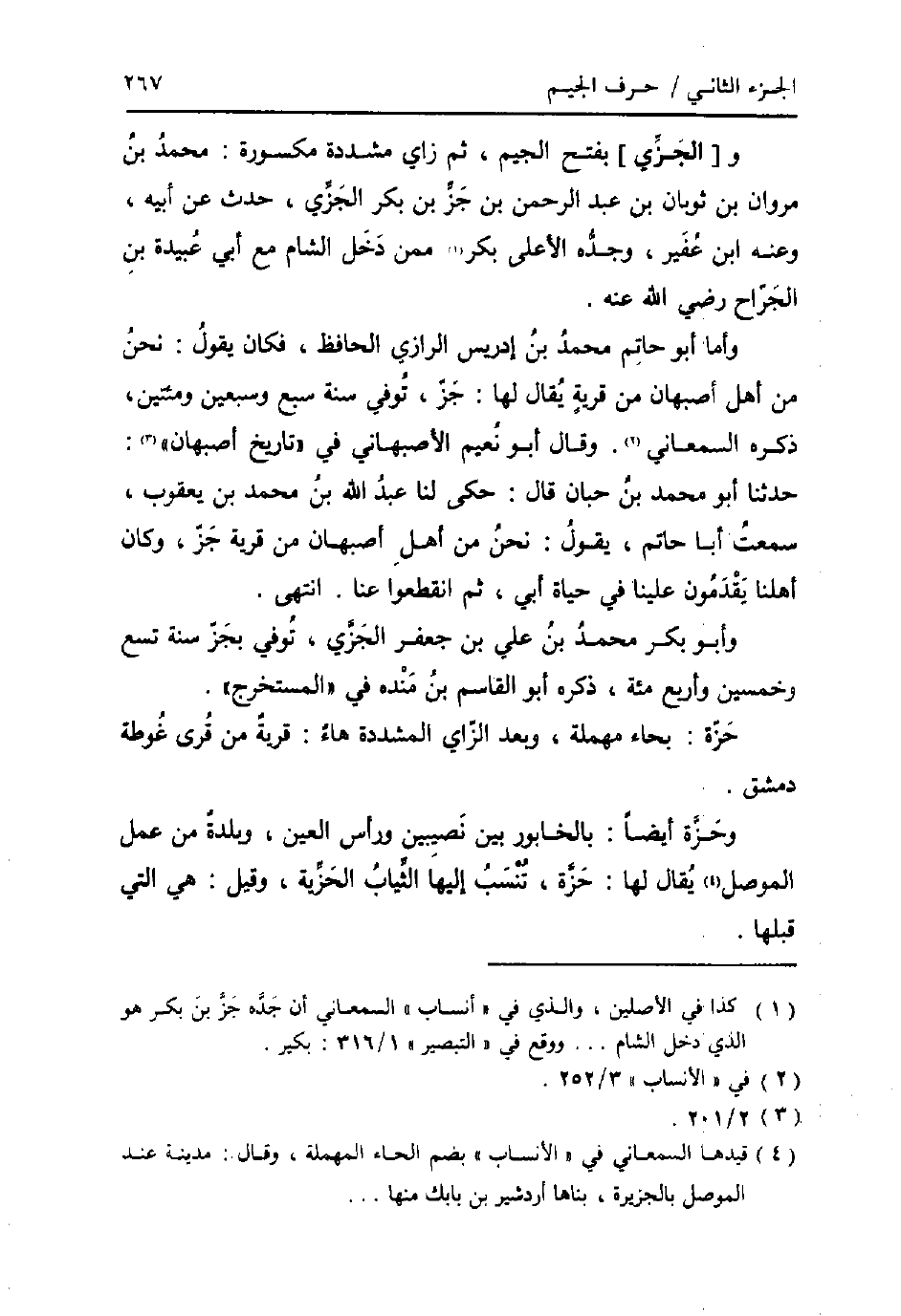 وَأما أَبُو حَاتِم مُحَمَّد بن إِدْرِيس الرَّازِيّ الْحَافِظ، فَكَانَ يَقُول: نَحن من أهل اصبهان من قَرْيَة يُقَال لَهَا: جز، توفّي سنة سبع وَسبعين ومئتين، ذكره السَّمْعَانِيّ. وَقَالَ أَبُو نعيم الاصبهاني فِي " تَارِيخ اصبهان ": حَدثنَا أَبُو مُحَمَّد بن حبَان قَالَ: حكى لنا عبد الله بن مُحَمَّد بن يَعْقُوب، سَمِعت أَبَا حَاتِم، يَقُول: نَحن من أهل اصبهان من قَرْيَة جز، وَكَانَ اهلنا يقدمُونَ علينا فِي حَيَاة ابي، ثمَّ انْقَطَعُوا عَنَّا. انْتهى.