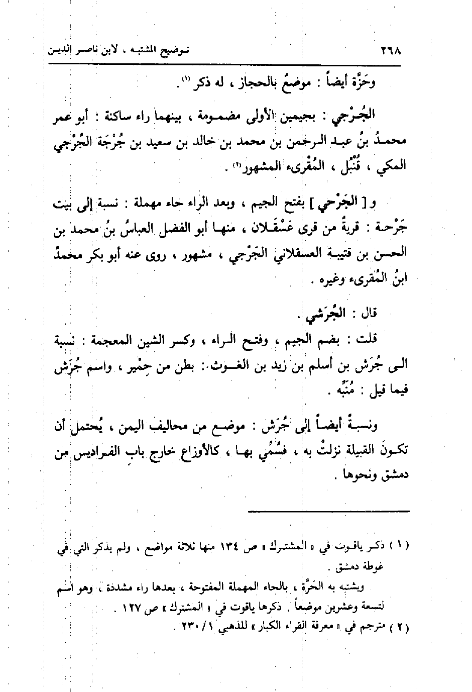 قلت: بِضَم الْجِيم، وَفتح الرَّاء، وَكسر الشين الْمُعْجَمَة: نِسْبَة إِلَى جرش بن اسْلَمْ بن زيد بن الْغَوْث: بطن من حمير، وَاسم جرش فِيمَا قيل: مُنَبّه.