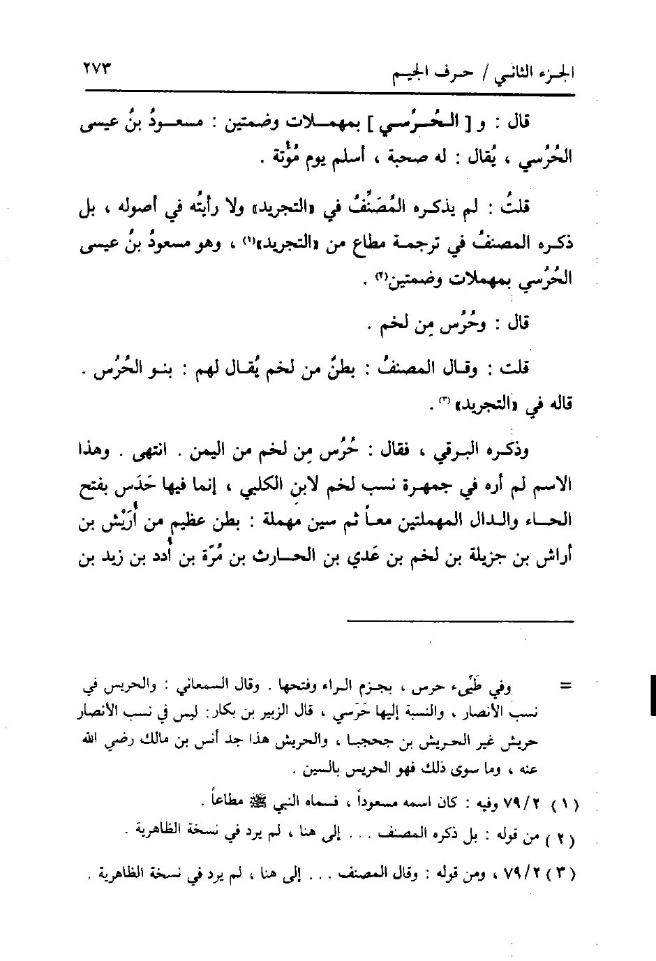 قَالَ: و [الحُرُسي] بمهملات وضمتين: مَسْعُود بن عِيسَى الحرسي، يُقَال: لَهُ صُحْبَة، اسْلَمْ يَوْم مُؤْتَة.