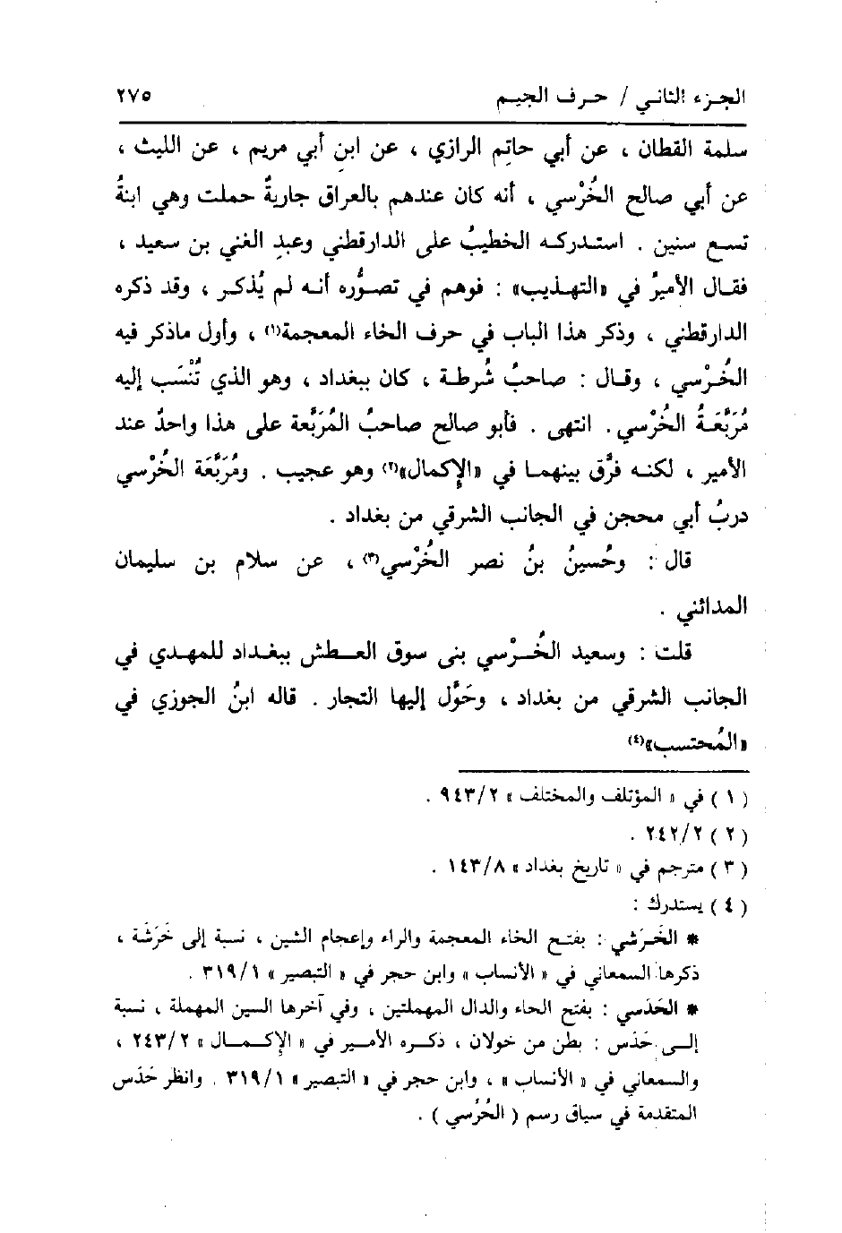 سَلمَة الْقطَّان، عَن أبي حَاتِم الرَّازِيّ، عَن ابْن أبي مَرْيَم، عَن اللَّيْث، عَن أبي صَالح الخرسي، انه كَانَ عِنْدهم بالعراق جَارِيَة حملت وَهِي ابْنة تسع سِنِين. استدركه الْخَطِيب على الدَّارَقُطْنِيّ وَعبد الْغَنِيّ بن سعيد، فَقَالَ الْأَمِير فِي " التَّهْذِيب ": فَوَهم فِي تصَوره انه لم يذكر، وَقد ذكره الدَّارَقُطْنِيّ، وَذكر هَذَا الْبَاب فِي حرف الْخَاء الْمُعْجَمَة، وَأول مَا ذكر فِيهِ الخرسي، وَقَالَ: صَاحب شرطة، كَانَ بِبَغْدَاد، وَهُوَ الَّذِي تنْسب إِلَيْهِ مربعة الخرسي. انْتهى. فَأَبُو صَالح صَاحب المربعة على هَذَا وَاحِد عِنْد الامير، لكنه فرق بَينهمَا فِي " الْإِكْمَال " وَهُوَ عَجِيب. مربعة الخرسي درب أبي محجن فِي الْجَانِب الشَّرْقِي من بَغْدَاد.