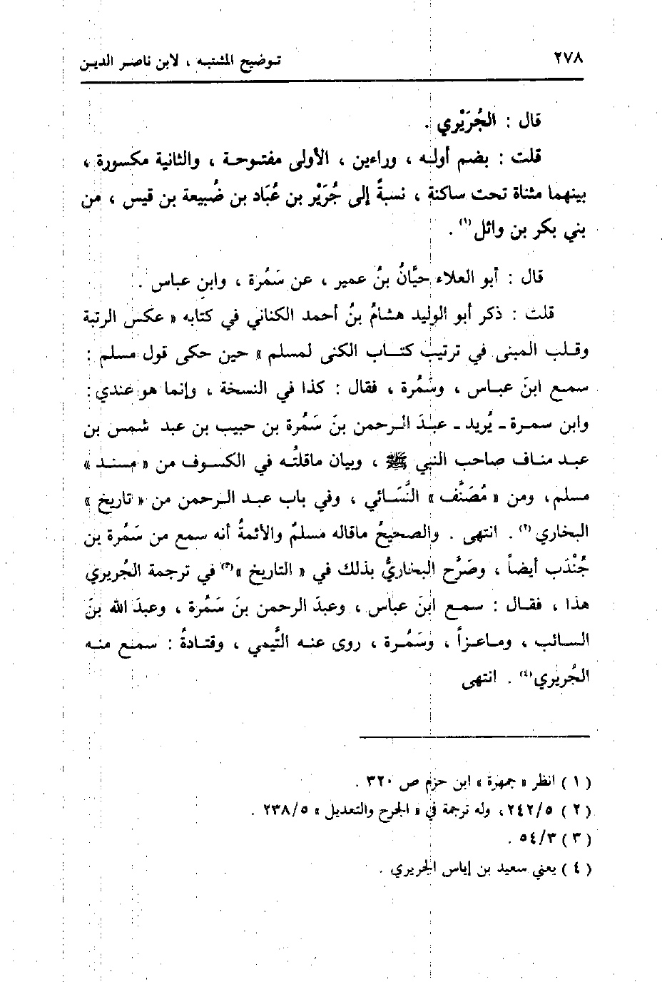 وقلب المبنى فِي تَرْتِيب كتاب الكنى لمُسلم " حِين حكى قَول مُسلم: سمع ابْن عَبَّاس، وَسمرَة، فَقَالَ: كَذَا فِي النُّسْخَة، وَإِنَّمَا هُوَ عِنْدِي: وَابْن سَمُرَة - يُرِيد - عبد الرَّحْمَن بن سَمُرَة بن حبيب بن عبد شمس بن عبد منَاف صَاحب النَّبِي صلى الله عَلَيْهِ وَسلم، وَبَيَان مَا قلته فِي الْكُسُوف من " مُسْند " مُسلم، وَمن " مُصَنف " النَّسَائِيّ، وَفِي بَاب عبد الرَّحْمَن من " تَارِيخ " البُخَارِيّ انْتهى. وَالصَّحِيح مَا قَالَه مُسلم وَالْأَئِمَّة انه سمع من سَمُرَة بن جُنْدُب أَيْضا، وَصرح البُخَارِيّ بذلك فِي " التَّارِيخ " فِي تَرْجَمَة الْجريرِي هَذَا، فَقَالَ: سمع ابْن عَبَّاس، وَعبد الرَّحْمَن بن سَمُرَة وَعبد الله بن السَّائِب، وماعزا، وَسمرَة، روى عَنهُ التَّيْمِيّ، وَقَتَادَة: سمع مِنْهُ الْجريرِي. انْتهى.