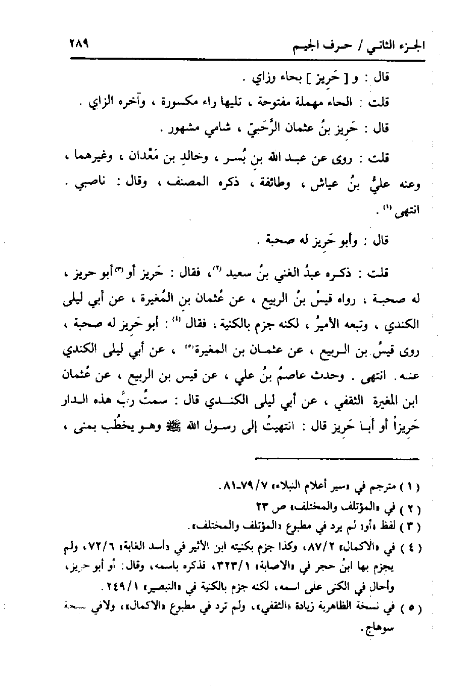 قلت: ذكره عبد الْغَنِيّ بن سعيد، فَقَالَ: حريز أَو أَبُو حريز، لَهُ صُحْبَة، رَوَاهُ قيس بن الرّبيع، عَن عُثْمَان بن الْمُغيرَة، عَن أبي ليلى الْكِنْدِيّ، وَتَبعهُ الامير، لكنه جزم بالكنية، فَقَالَ: أَبُو حريز لَهُ صُحْبَة، روى قيس بن الرّبيع، عَن عُثْمَان بن الْمُغيرَة، عَن أبي ليلى الْكِنْدِيّ عَنهُ. انْتهى. وَحدث عَاصِم بن عَليّ، عَن قيس بن الرّبيع، عَن عُثْمَان ابْن الْمُغيرَة الثَّقَفِيّ، عَن أبي ليلى الْكِنْدِيّ قَالَ: سمت رب هَذِه الدَّار حريزا أَو أَبَا حريز قَالَ: انْتَهَيْت إِلَى رَسُول الله صلى الله عَلَيْهِ وَسلم وَهُوَ يخْطب بمنى،