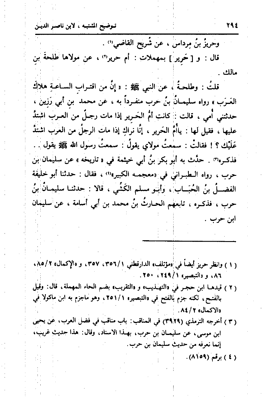 قلت: وَطَلْحَة، عَن النَّبِي صلى الله عَلَيْهِ وَسلم: " أَن من اقتراب السَّاعَة هَلَاك الْعَرَب " رَوَاهُ سُلَيْمَان بن حَرْب مُنْفَردا بِهِ، عَن مُحَمَّد بن أبي رزين، حَدَّثتنِي امي، قَالَت: كَانَت أم الْحَرِير إِذا مَاتَ رجل من الْعَرَب اشْتَدَّ عَلَيْهَا، فَقيل لَهَا: يَا أم الْحَرِير، إِنَّا نرَاك إِذا مَاتَ الرجل من الْعَرَب اشْتَدَّ عَلَيْك؟ ! فَقَالَت: سَمِعت مولَايَ يَقُول: سَمِعت رَسُول الله صلى الله عَلَيْهِ وَسلم يَقُول. . فَذكره. حدث بِهِ أَبُو بكر بن أبي خَيْثَمَة فِي " تَارِيخه " عَن سُلَيْمَان بن حَرْب، رَوَاهُ الطَّبَرَانِيّ فِي " مُعْجَمه الْكَبِير "، فَقَالَ: حَدثنَا أَبُو خَليفَة الْفضل بن الْحباب، وَأَبُو مُسلم الْكشِّي، قَالَا: حَدثنَا سُلَيْمَان بن حَرْب، فَذكره، تَابعهمْ الْحَارِث بن مُحَمَّد بن أبي اسامة، عَن سُلَيْمَان ابْن حَرْب.