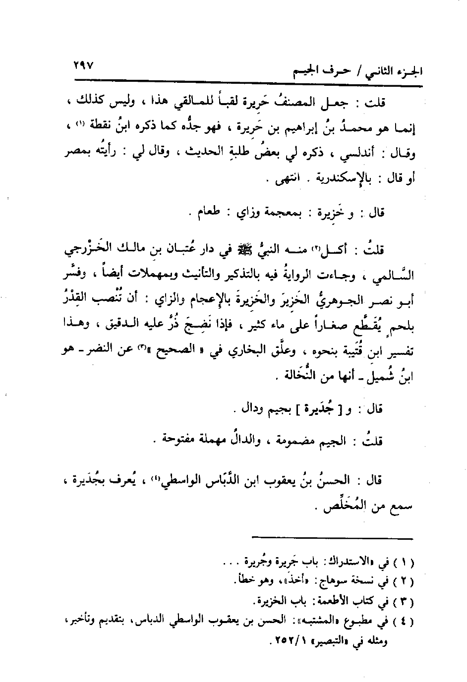 قلت: أكل مِنْهُ النَّبِي صلى الله عَلَيْهِ وَسلم فِي دَار عتْبَان بن مَالك الخزرجي السالمي، وَجَاءَت الرِّوَايَة فِيهِ بالتذكير والتأنيث وبمهملات ايضا، وَفسّر أَبُو نصر الْجَوْهَرِي الخزير والخزيرة بالإعجام وَالزَّاي: أَن تنصب الْقدر بِلَحْم يقطع صغَارًا على مَاء كثير، فَإِذا نضج ذَر عَلَيْهِ الدَّقِيق، وَهَذَا تَفْسِير ابْن قُتَيْبَة بِنَحْوِهِ، وعلق البُخَارِيّ فِي " الصَّحِيح " عَن النَّضر - هُوَ ابْن شُمَيْل - انها من النخالة.
