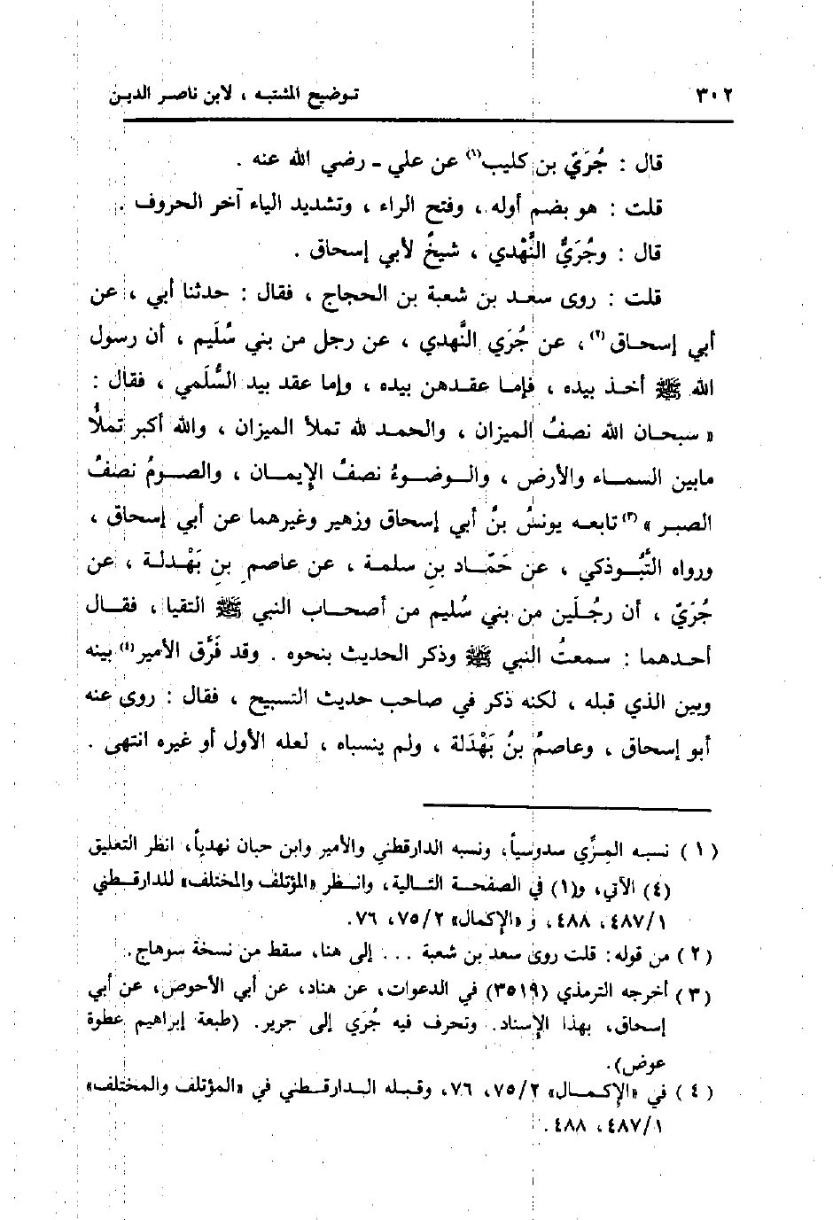 قلت: روى سعد بن شُعْبَة بن الْحجَّاج، فَقَالَ: حَدثنَا أبي، عَن أبي إِسْحَاق، عَن جري النَّهْدِيّ، عَن رجل من بني سليم، أَن رَسُول الله صلى الله عَلَيْهِ وَسلم اخذ بِيَدِهِ، فإمَّا عقدهن بِيَدِهِ، وَإِمَّا عقد بيد السّلمِيّ، فَقَالَ: " سُبْحَانَ الله نصف الْمِيزَان، وَالْحَمْد لله تملأ الْمِيزَان، وَالله أكبر تملأ مَا بَين السَّمَاء والارض، وَالْوُضُوء نصف الايمان، وَالصَّوْم نصف الصَّبْر " تَابعه يُونُس بن أبي إِسْحَاق وَزُهَيْر وَغَيرهمَا عَن أبي اسحاق، وَرَوَاهُ التَّبُوذَكِي، عَن حَمَّاد بن سَلمَة، عَن عَاصِم بن بَهْدَلَة، عَن جري، أَن رجلَيْنِ من بني سليم من أَصْحَاب النَّبِي صلى الله عَلَيْهِ وَسلم التقيا، فَقَالَ: أَحدهمَا: سَمِعت النَّبِي صلى الله عَلَيْهِ وَسلم وَذكر الحَدِيث بِنَحْوِهِ. وَقد فرق الْأَمِير بَينه وَبَين الَّذِي قبله، لكنه ذكر فِي صَاحب حَدِيث التَّسْبِيح، فَقَالَ: روى عَنهُ أَبُو إِسْحَاق، وَعَاصِم بن بَهْدَلَة، وَلم ينسباه، لَعَلَّه الأول أَو غَيره انْتهى.