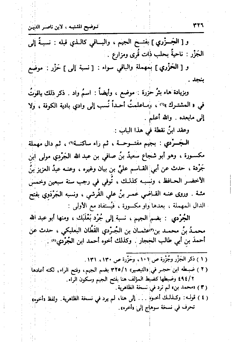 و [الحَزري] بِمُهْملَة وَالْبَاقِي سَوَاء: [نِسْبَة إِلَى] حَزْر: مَوضِع بِنَجْد.