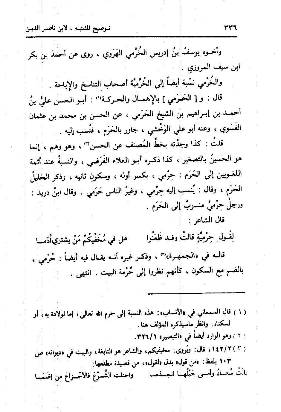 قلت: كَذَا وجدته بِخَط المُصَنّف عَن الْحسن، وَهُوَ وهم، إِنَّمَا هُوَ الْحُسَيْن بِالتَّصْغِيرِ، كَذَا ذكره أَبُو الْعَلَاء الفرضي، وَالنِّسْبَة عِنْد ائمة اللغويين إِلَى الْحَرَام: حرمي، بِكَسْر أَوله، وَسُكُون ثَانِيه، وَذكر الْخَلِيل الْحرم، وَقَالَ: ينْسب إِلَيْهِ حرمي، وَغير النَّاس حرمي. وَقَالَ ابْن دُرَيْد: وَرجل حرمي مَنْسُوب إِلَى الْحرم.