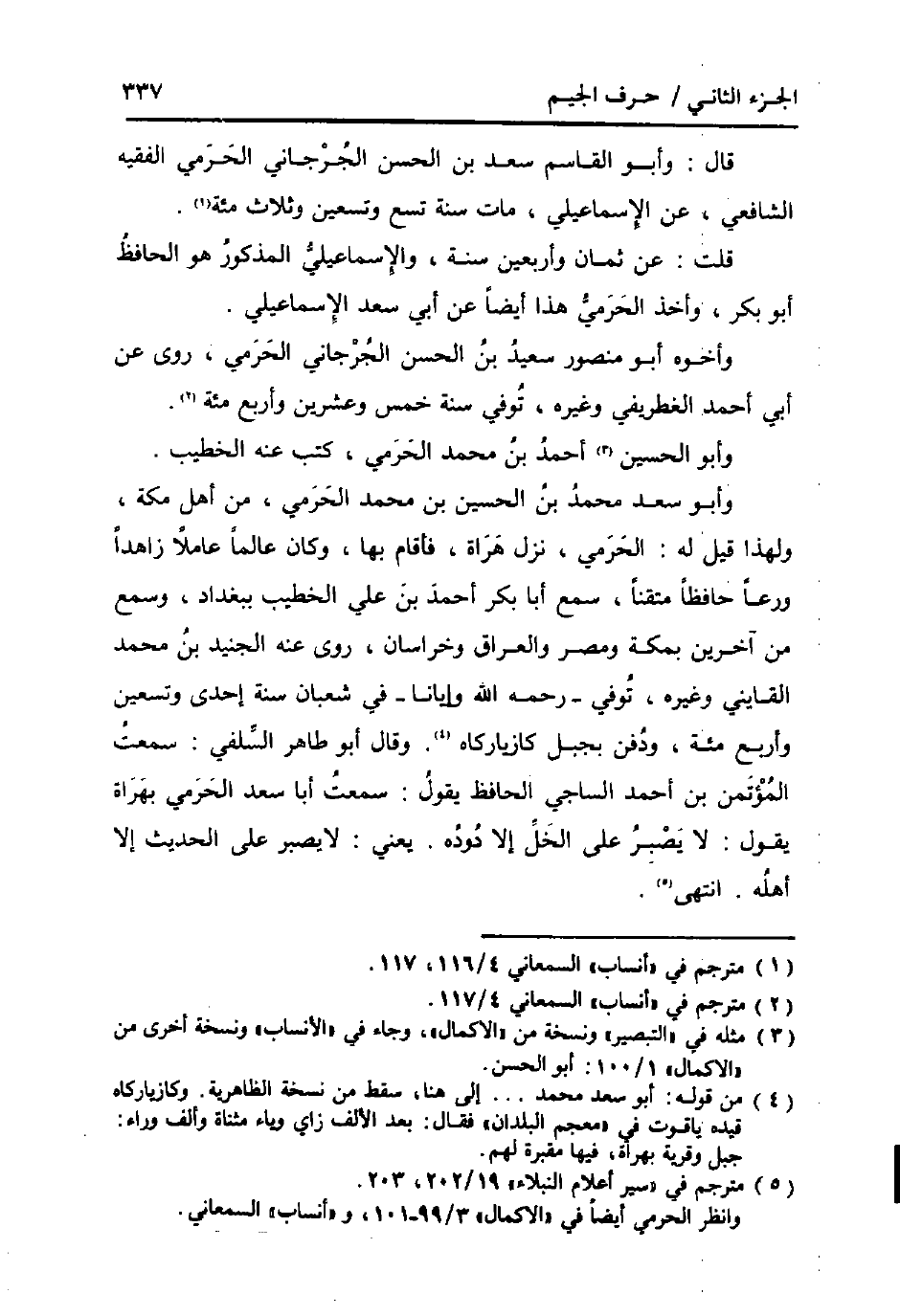 وَأَبُو سعد مُحَمَّد بن الْحُسَيْن بن مُحَمَّد الحرمي، من أهل مَكَّة، وَلِهَذَا قيل لَهُ: الحرمي، نزل هراة، فَأَقَامَ بهَا، وَكَانَ عَالما عَاملا زاهدا ورعا حَافِظًا متقنا، سمع أَبَا بكر أَحْمد بن عَليّ الْخَطِيب بِبَغْدَاد، وَسمع من آخَرين بِمَكَّة ومصر وَالْعراق وخراسان، روى عَنهُ الْجُنَيْد بن مُحَمَّد القايني وَغَيره، توفّي - رَحمَه الله وإيانا - فِي شعْبَان سنة إِحْدَى وَتِسْعين وَأَرْبع مئة، وَدفن بجبل كازياركاه. وَقَالَ أَبُو طَاهِر السلَفِي: سَمِعت المؤتمن بن أَحْمد السَّاجِي الْحَافِظ يَقُول: سَمِعت أَبَا سعد الحرمي بهراة يَقُول: لَا يصبر على الْخلّ إِلَّا دوده. يَعْنِي: لَا يصبر على الحَدِيث إِلَّا أَهله. انْتهى.