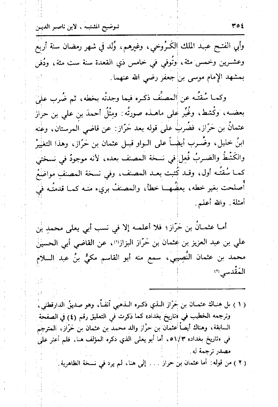 وَأبي الْفَتْح عبد الْملك الكروخي، وَغَيره، ولد فِي شهر رَمَضَان سنة أَربع وَعشْرين وَخمْس مئة، وَتُوفِّي فِي خَامِس ذِي الْقعدَة سنة سِتّ مئة، وَدفن بمشهد الإِمَام مُوسَى بن جَعْفَر رَضِي الله عَنْهُمَا. وكما سقته عَن المُصَنّف ذكره فِيمَا وجدته بِخَطِّهِ، ثمَّ ضرب على بعضه، وكشط، وَغير على مَا هَذِه صورته، وَمثل أَحْمد بن عَليّ بن حراز عُثْمَان بن حراز، فَضرب على قَوْله بعد حراز: عَن قَاضِي المرستان، وَعنهُ ابْن خَلِيل، وَضرب أَيْضا على الْوَاو قبل عُثْمَان بن حراز، وَهَذَا التَّغْيِير والكشط وَالضَّرْب فعل فِي نُسْخَة المُصَنّف بعده، لِأَنَّهُ مَوْجُود فِي نُسْخَتي كَمَا سقته اول، وَقد كتبت بعد المُصَنّف، وَفِي نُسْخَة المُصَنّف مَوَاضِع اصلحت بِغَيْر خطه، بَعْضهَا خطأ، وَالْمُصَنّف بَرِيء مِنْهُ كَمَا قَدمته فِي أَمْثِلَة. وَالله اعْلَم.