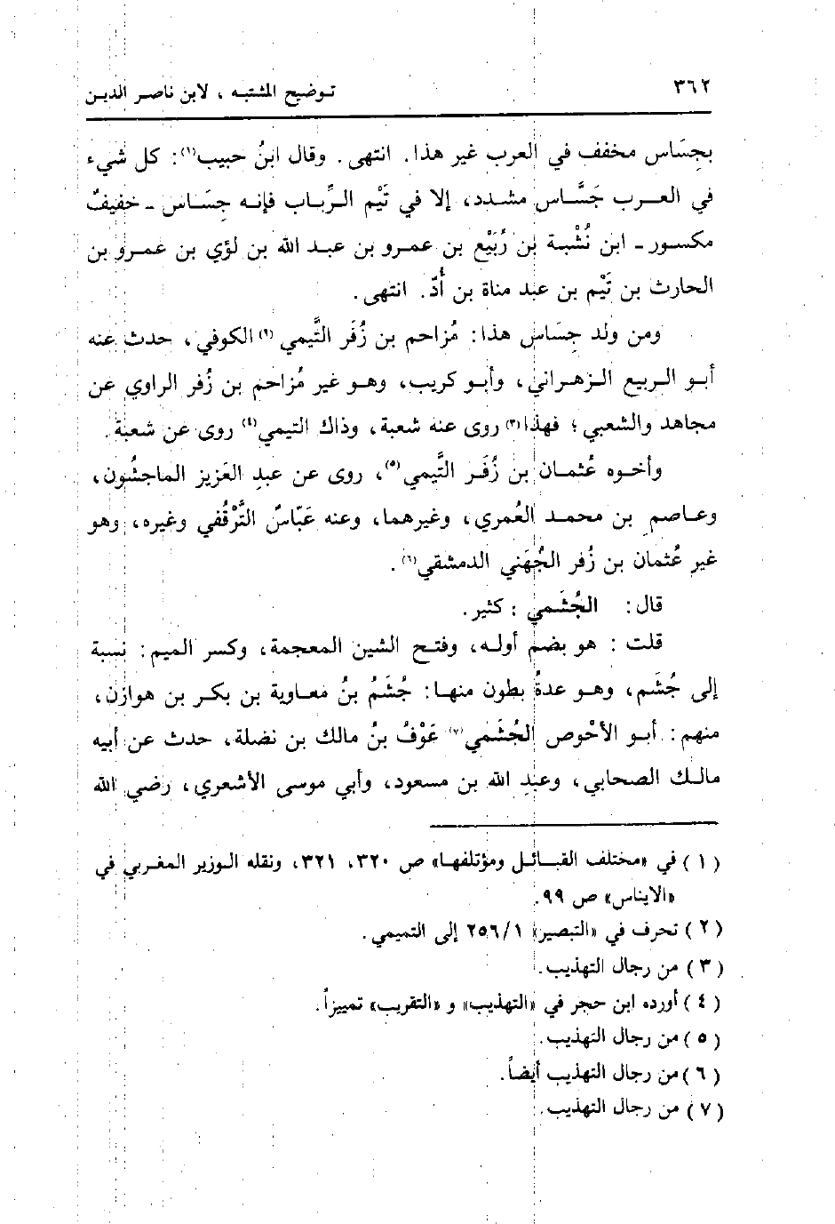 قلت: هُوَ بِضَم اوله، وَفتح الشين الْمُعْجَمَة، وَكسر الْمِيم: نِسْبَة إِلَى جشم، وَهُوَ عدَّة بطُون مِنْهَا: جشم بن مُعَاوِيَة بن بكر بن هوَازن، مِنْهُم: أَبُو الاحوص الْجُشَمِي عَوْف بن مَالك بن نَضْلَة، حدث عَن أَبِيه مَالك الصَّحَابِيّ، وَعبد الله بن مَسْعُود، وَأبي مُوسَى الاشعري، رَضِي الله