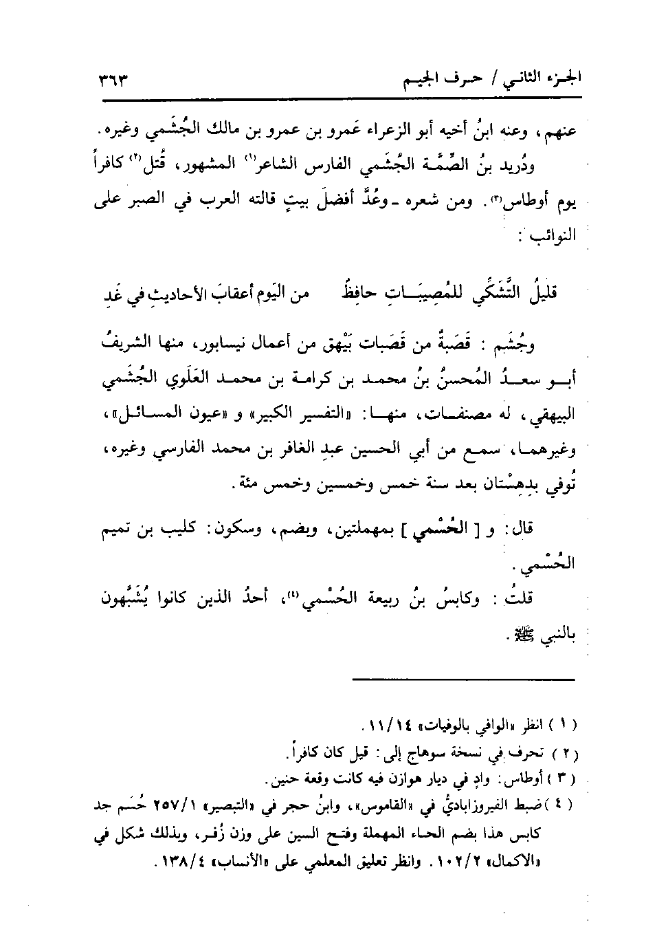 وجشم: قَصَبَة من قصبات بيهق من أَعمال نيسابور، مِنْهَا الشريف أَبُو سعد المحسن بن مُحَمَّد بن كَرَامَة بن مُحَمَّد الْعلوِي الْجُشَمِي الْبَيْهَقِيّ، لَهُ مصنفات، مِنْهَا: " التَّفْسِير الْكَبِير " و " عُيُون الْمسَائِل "، وَغَيرهمَا، سمع من أبي الْحُسَيْن عبد الغافر بن مُحَمَّد الْفَارِسِي وَغَيره، توفّي بدهستان بعد سنة خمس وَخمسين وَخمْس مئة.