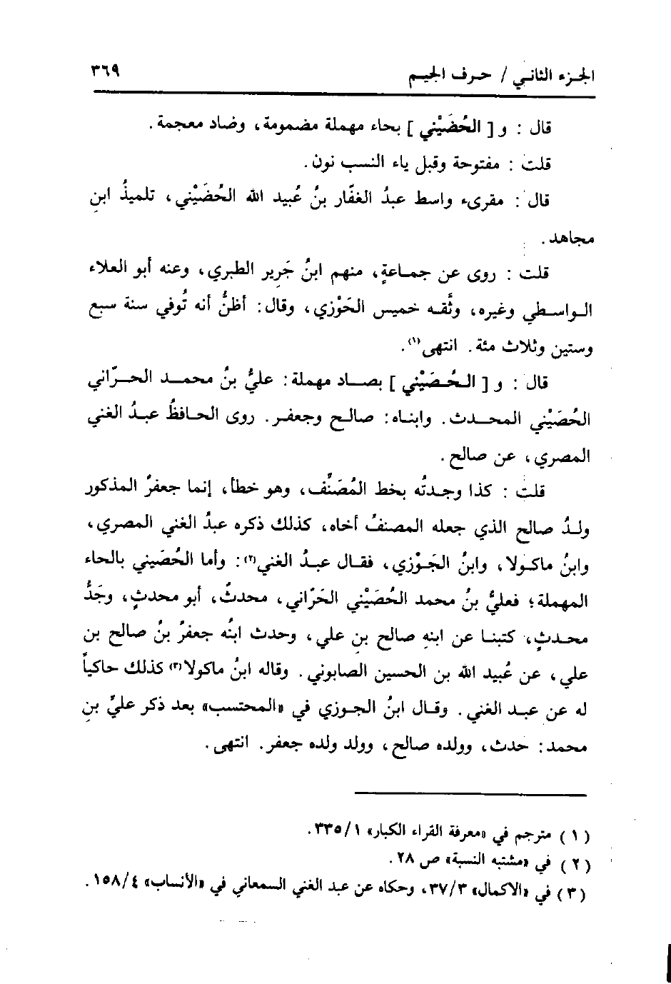 قَالَ: و [الحُصَيْني] بصاد مُهْملَة: عَليّ بن مُحَمَّد الْحَرَّانِي الحصيني الْمُحدث. وابناه: صَالح وجعفر. روى الْحَافِظ عبد الْغَنِيّ الْمصْرِيّ، عَن صَالح.