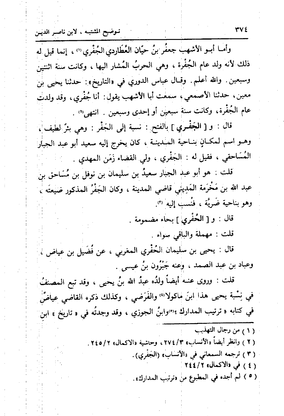 وَأما أَبُو الاشهب جَعْفَر بن حَيَّان العطاردي الْجفْرِي، إِنَّمَا قيل لَهُ ذَلِك لِأَنَّهُ ولد عَام الجفرة، وَهِي الْحَرْب الْمشَار إِلَيْهَا، وَكَانَت سنة اثْنَتَيْنِ وَسبعين. وَالله اعْلَم. وَقَالَ عَبَّاس الدوري فِي " التَّارِيخ ": حَدثنَا يحيى بن معِين، حَدثنَا الاصمعي، سَمِعت أَبَا الاشهب يَقُول: أَنا جفري، وَقد ولدت عَام الجفرة، وَكَانَت سنة سبعين أَو إِحْدَى وَسبعين. انْتهى.