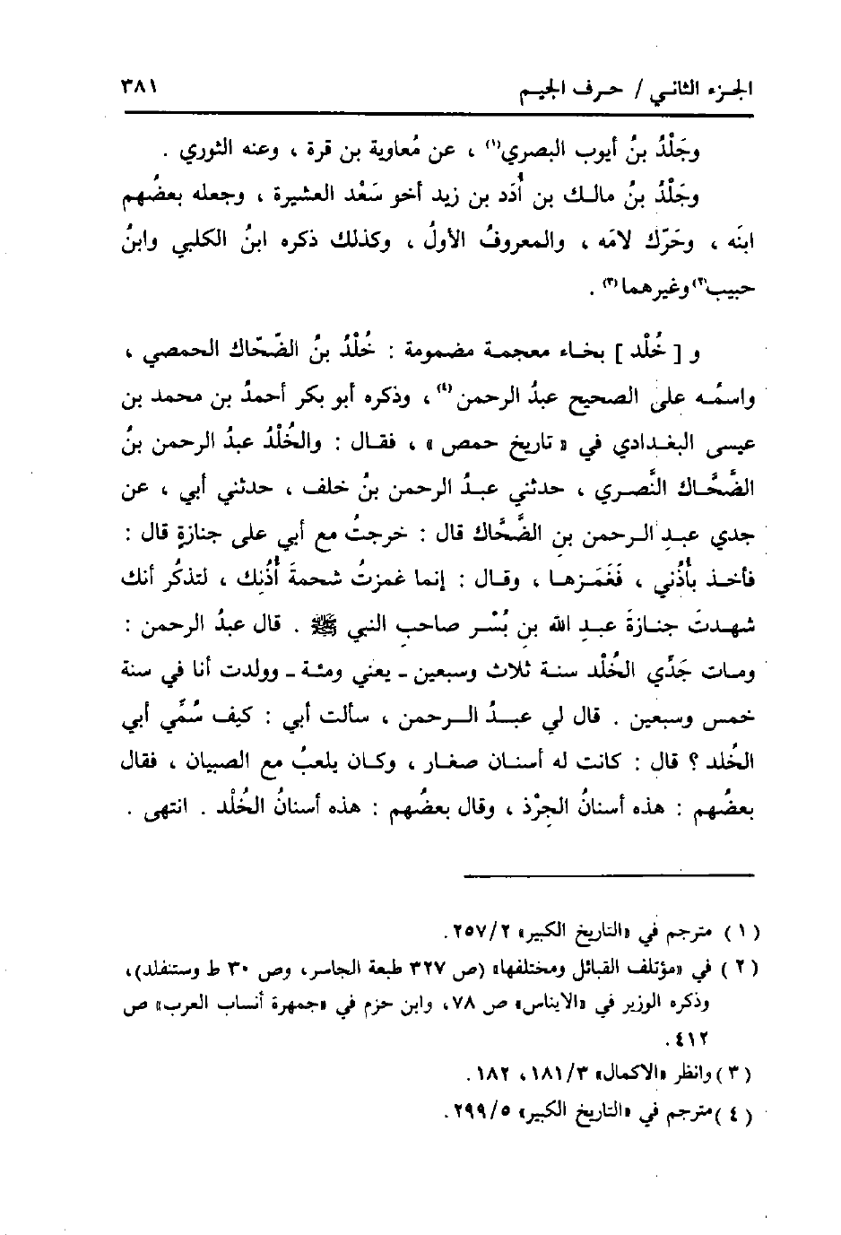 و [خُلْد] بخاء مُعْجمَة مَضْمُومَة: خلد بن الضَّحَّاك الْحِمصِي، واسْمه على الصَّحِيح عبد الرَّحْمَن، وَذكره أَبُو بكر أَحْمد بن مُحَمَّد بن عِيسَى الْبَغْدَادِيّ فِي " تَارِيخ حمص "، فَقَالَ: والخلد عبد الرَّحْمَن بن الضَّحَّاك النصري، حَدثنِي عبد الرَّحْمَن بن خلف، حَدثنِي أبي، عَن جدي عبد الرَّحْمَن بن الضَّحَّاك قَالَ: خرجت مَعَ أبي على جَنَازَة قَالَ: فَأخذ بأذني، فغمزها، وَقَالَ: إِنَّمَا غمزت شحمة أُذُنك، لتذكر انك شهِدت جَنَازَة عبد الله بن بسر صَاحب النَّبِي صلى الله عَلَيْهِ وَسلم. قَالَ عبد الرَّحْمَن: وَمَات جدي الْخلد سنة ثَلَاث وَسبعين - يَعْنِي ومئة - وَولدت أَنا فِي سنة خمس وَسبعين. قَالَ لي عبد الرَّحْمَن، سَأَلت أبي: كَيفَ سمي أبي الْخلد؟ قَالَ: كَانَت لَهُ اسنان صغَار، وَكَانَ يلْعَب مَعَ الصّبيان، فَقَالَ بَعضهم: هَذِه اسنان الجرذ، وَقَالَ بَعضهم: هَذِه اسنان الْخلد. انْتهى.