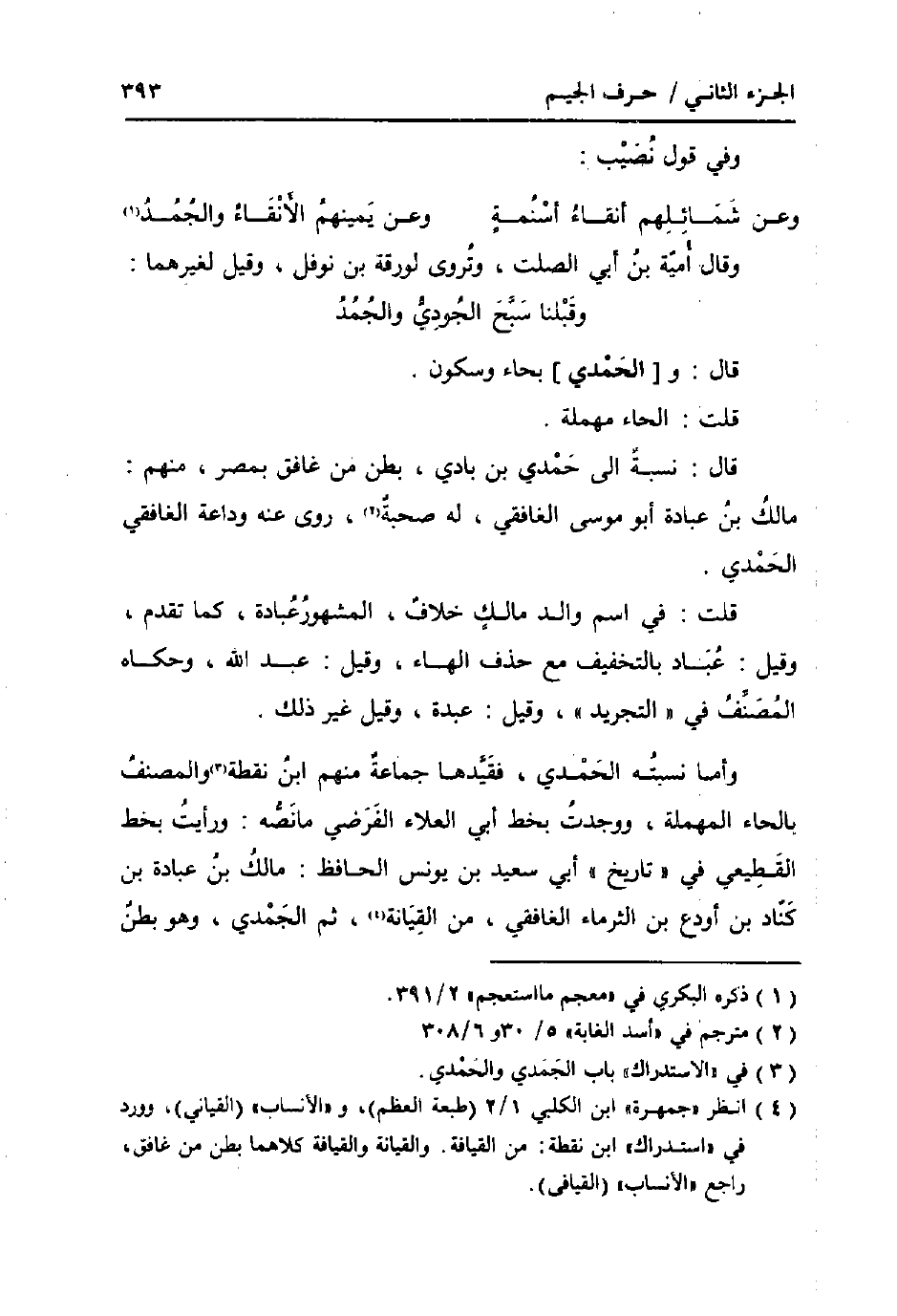 وَأما نسبته الحمدي، فقيدها جمَاعَة مِنْهُم ابْن نقطة وَالْمُصَنّف بِالْحَاء الْمُهْملَة، وَوجدت بِخَط أبي الْعَلَاء الفرضي مَا نَصه: وَرَأَيْت بِخَط الْقطيعِي فِي " تَارِيخ " أبي سعيد بن يُونُس الْحَافِظ: مَالك بن عبَادَة بن كناد بن اودع بن الثرماء الغافقي، من القيانة، ثمَّ الجمدي، وَهُوَ بطن