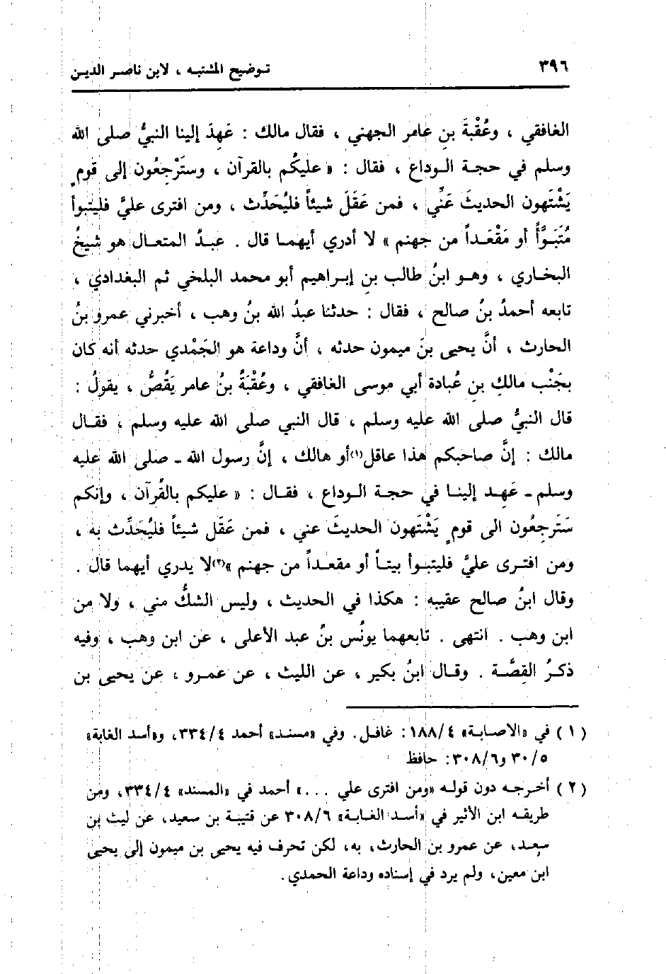الغافقي، وَعقبَة بن عَامر الْجُهَنِيّ، فَقَالَ مَالك: عهد إِلَيْنَا النَّبِي صلى الله عَلَيْهِ وَسلم فِي حجَّة الْوَدَاع، فَقَالَ: " عَلَيْكُم بِالْقُرْآنِ وسترجعون إِلَى قوم يشتهون الحَدِيث عني، فَمن عقل شَيْئا فليحدث، وَمن افترى عَليّ فَليَتَبَوَّأ متبوأ أَو مقْعدا من جَهَنَّم " لَا أَدْرِي ايهما قَالَ. عبد المتعال هُوَ شيخ البُخَارِيّ، وَهُوَ ابْن طَالب بن إِبْرَاهِيم أَبُو مُحَمَّد الْبَلْخِي ثمَّ الْبَغْدَادِيّ، تَابعه أَحْمد بن صَالح، فَقَالَ: حَدثنَا عبد الله بن وهب، اخبرني عَمْرو بن الْحَارِث، أَن يحيى بن مَيْمُون حَدثهُ، أَن ودَاعَة هُوَ الجمدي حَدثهُ انه كَانَ بِجنب مَالك بن عبَادَة أبي مُوسَى الغافقي، وَعقبَة بن عَامر يقص، يَقُول: قَالَه النَّبِي صلى الله عَلَيْهِ وَسلم، قَالَ النَّبِي صلى الله عَلَيْهِ وَسلم، فَقَالَ مَالك: إِن صَاحبكُم هَذَا عَاقل أَو هَالك، إِن رَسُول الله - صلى الله عَلَيْهِ وَسلم - عهد الينا فِي حجَّة الْوَدَاع، فَقَالَ: عَلَيْكُم بِالْقُرْآنِ، وَإِنَّكُمْ سترجعون إِلَى قوم يشتهون الحَدِيث عني، فَمن عقل شَيْئا فليحدث بِهِ، وَمن افترى عَليّ فَليَتَبَوَّأ بَيْتا أَو مقْعدا من جَهَنَّم " لَا يدْرِي ايهما قَالَ: وَقَالَ ابْن صَالح عَقِيبه: هَكَذَا فِي الحَدِيث، وَلَيْسَ الشَّك مني، وَلَا من ابْن وهب. انْتهى. تابعهما يُونُس بن عبد الاعلى، عَن ابْن وهب، وَفِيه ذكر الْقِصَّة. وَقَالَ ابْن بكير، عَن اللَّيْث، عَن عَمْرو عَن يحيى بن