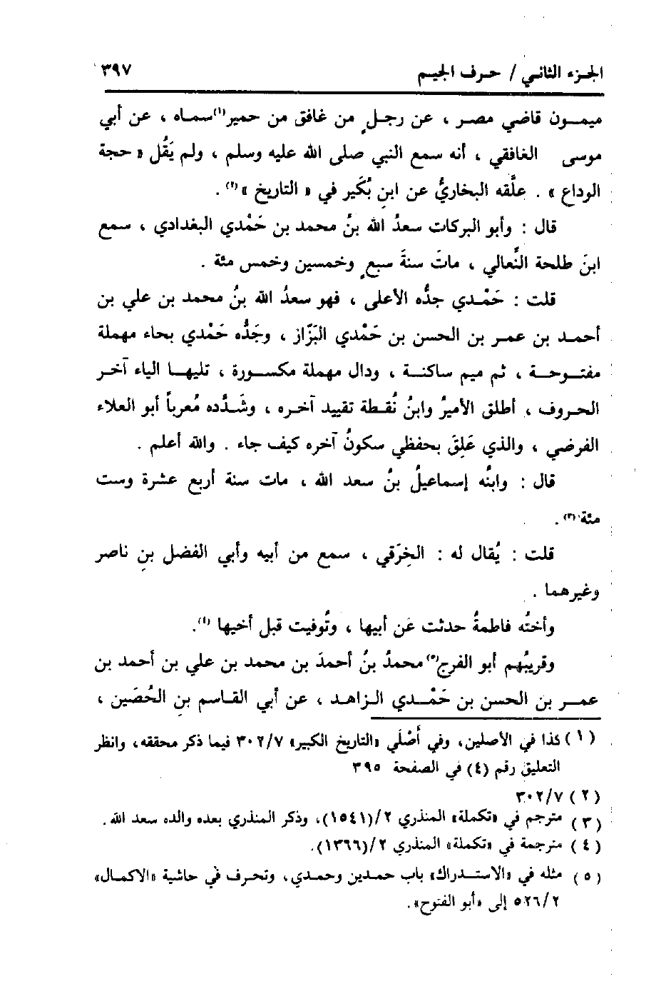 قلت: حمدي جده الْأَعْلَى، فَهُوَ سعد الله بن مُحَمَّد بن عَليّ بن أَحْمد بن عمر بن الْحسن بن حمدي الْبَزَّاز، وجده حمدي بحاء مُهْملَة مَفْتُوحَة، ثمَّ مِيم سَاكِنة، ودال مُهْملَة مَكْسُورَة، تَلِيهَا الْيَاء آخر الْحُرُوف، أطلق الْأَمِير وَابْن نقطة تَقْيِيد آخِره، وشدده معربا أَبُو الْعَلَاء الفرضي، وَالَّذِي علق بحفظي سُكُون آخِره كَيفَ جَاءَ. وَالله أعلم.