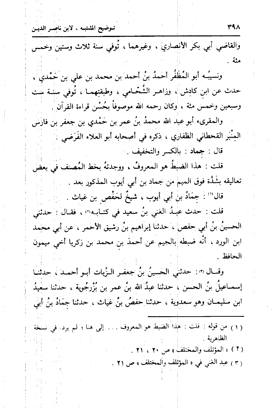 وَالْقَاضِي أبي بكر الانصاري، وَغَيرهمَا، توفّي سنة ثَلَاث وَسِتِّينَ وَخمْس مئة. ونسيبه أَبُو المظفر أَحْمد بن أَحْمد بن مُحَمَّد بن عَليّ بن حمدي، حدث عَن ابْن كادش، وزاهر الشحامي، وطبقتهما، توفّي سنة سِتّ وَسبعين وَخمْس مئة، وَكَانَ رَحمَه الله مَوْصُوفا بِحسن قِرَاءَة الْقُرْآن. والمقرئ أَبُو عبد الله مُحَمَّد بن عمر بن حمدي بن جَعْفَر بن فَارس. الْمِنْبَر القحطاني الظفاري، ذكره فِي أَصْحَابه أَبُو الْعَلَاء الفرضي.