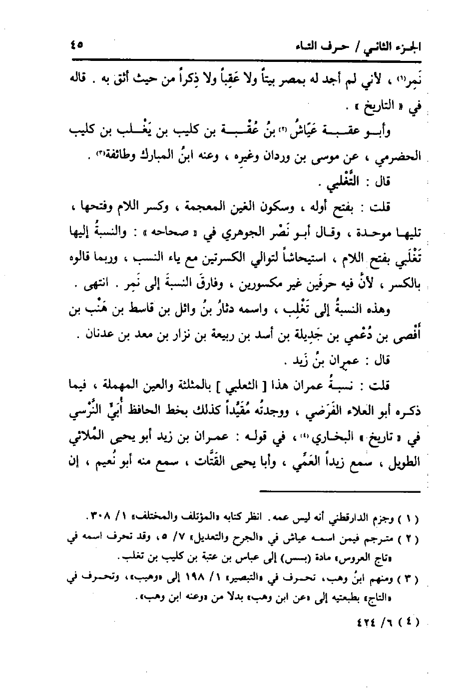 قلت: نِسْبَة عمرَان هَذَا [الثَّعْلَبِيّ] بِالْمُثَلثَةِ وَالْعين الْمُهْملَة، فِيمَا ذكره أَبُو الْعَلَاء الفرضي، وَوَجَدته مُقَيّدا كَذَلِك بِخَط الْحَافِظ ابي النَّرْسِي فِي " تَارِيخ " البُخَارِيّ، فِي قَوْله: عمرَان بن زيد أَبُو يحيى الْملَائي الطَّوِيل، سمع زيدا الْعمي، وَأَبا يحيى القَتَّات، سمع مِنْهُ أَبُو نعيم، إِن