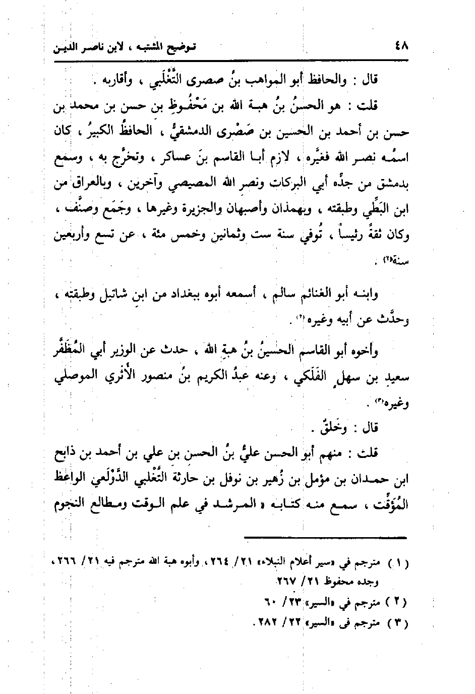 قلت هُوَ الْحسن بن هبة الله بن مَحْفُوظ بن حسن بن مُحَمَّد بن حسن بن أَحْمد بن الْحُسَيْن بن صصرى الدِّمَشْقِي، الْحَافِظ الْكَبِير، كَانَ اسْمه نصر الله فَغَيره، لَازم أَبَا الْقَاسِم بن عَسَاكِر وَتخرج بِهِ، وَسمع بِدِمَشْق من جده أبي البركات وَنصر الله المصِّيصِي وَآخَرين، وبالعراق من ابْن البطي وطبقته، وبهمذان واصبهان والجزيرة وَغَيرهَا، وَجمع وصنف، وَكَانَ ثِقَة رَئِيسا، توفّي سنة سِتّ وَثَمَانِينَ وَخمْس مئة، عَن تسع واربعين سنة.