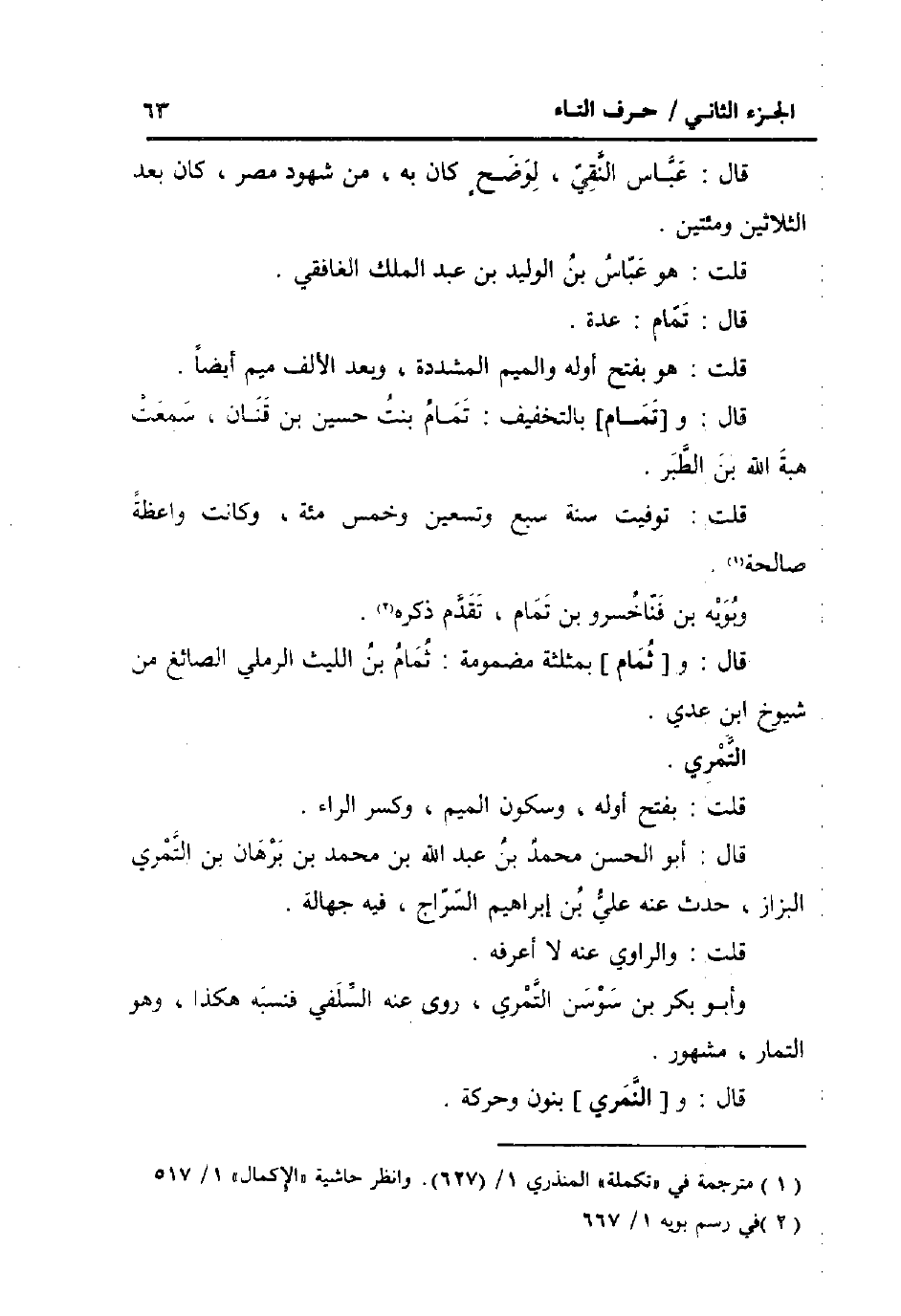 قَالَ: و [تَمَام] بِالتَّخْفِيفِ: تَمام بنت حُسَيْن بن قنان، سَمِعت هبة الله بن الطبر.