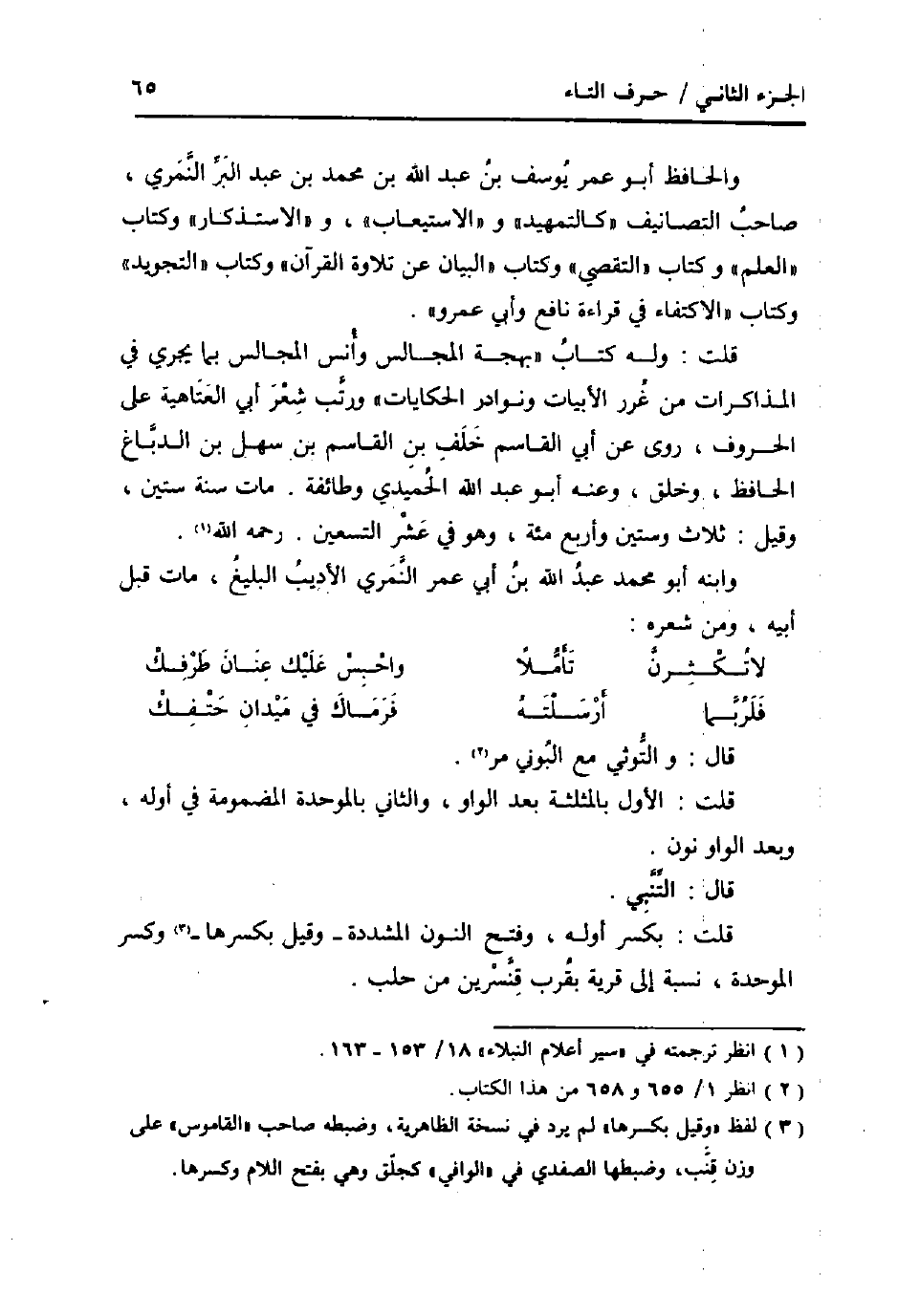 والحافظ أَبُو عمر يُوسُف بن عبد الله بن مُحَمَّد بن عبد الْبر النمري، صَاحب التصانيف " كالتمهيد " و " الِاسْتِيعَاب "، و " الاستذكار " وَكتاب " الْعلم " وَكتاب " التَّقَصِّي " وَكتاب " الْبَيَان عَن تِلَاوَة الْقُرْآن "، وَكتاب " التجويد " وَكتاب " الِاكْتِفَاء فِي قِرَاءَة نَافِع وابي عَمْرو ".
