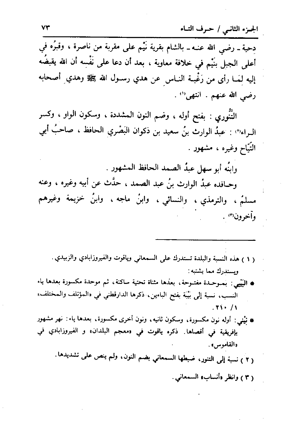 التنوري: بِفَتْح اوله، وَضم النُّون الْمُشَدّدَة، وَسُكُون الْوَاو، وَكسر الرَّاء: عبد الْوَارِث بن سعيد بن ذكْوَان الْبَصْرِيّ الْحَافِظ، صَاحب أبي التياح وَغَيره، مَشْهُور.