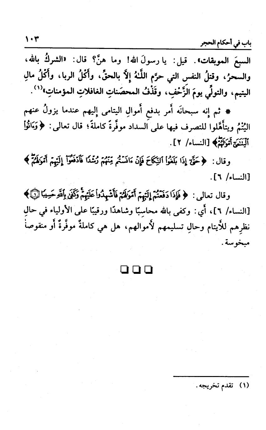 ثم إنه سبحانه أمر بدفع أموال اليتامى إليهم عندما يزول عنهم اليتم ويتأهلون للتصرف فيها على السداد موفرة كاملة، قال تعالى: {وَآتُوا الْيَتَامَى أَمْوَالَهُم} ، وقال: {حَتَّى إِذَا بَلَغُوا النِّكَاحَ فَإِنْ آنَسْتُمْ مِنْهُمْ رُشْداً فَادْفَعُوا إِلَيْهِمْ أَمْوَالَهُمْ وَلا تَأْكُلُوهَا إِسْرَافاً وَبِدَاراً أَنْ يَكْبَرُوا وَمَنْ كَانَ غَنِيّاً فَلْيَسْتَعْفِفْ وَمَنْ كَانَ فَقِيراً فَلْيَأْكُلْ بِالْمَعْرُوفِ فَإِذَا دَفَعْتُمْ إِلَيْهِمْ أَمْوَالَهُمْ فَأَشْهِدُوا عَلَيْهِمْ وَكَفَى بِاللَّهِ حَسِيباً} ؛ أي: وكفى بالله محاسبا وشاهدًا ورقيبا على الأولياء في حال نظرهم للأيتام وحال تسليمهم لأموالهم هل هي كاملة موفرة أو منقوصة مبخوسة.