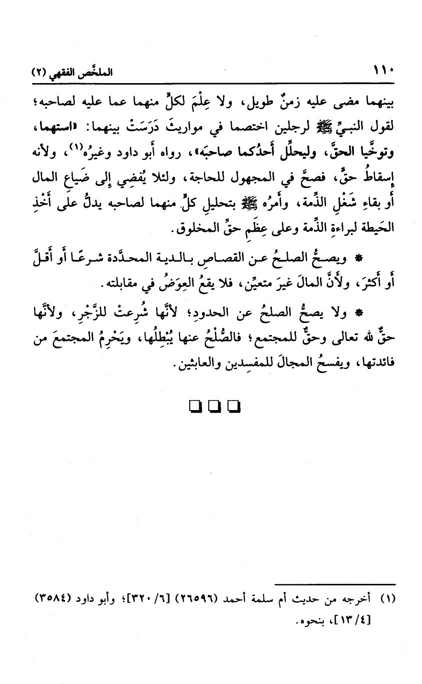 ولا يصح الصلح عن الحدود؛ لأنها شرعت للزجر، ولأنها حق لله تعالى وحق للمجتمع؛ فالصلح عنها يبطلها، ويحرم المجتمع من فائدتها، ويفسح المجال للمفسدين والعابثين.