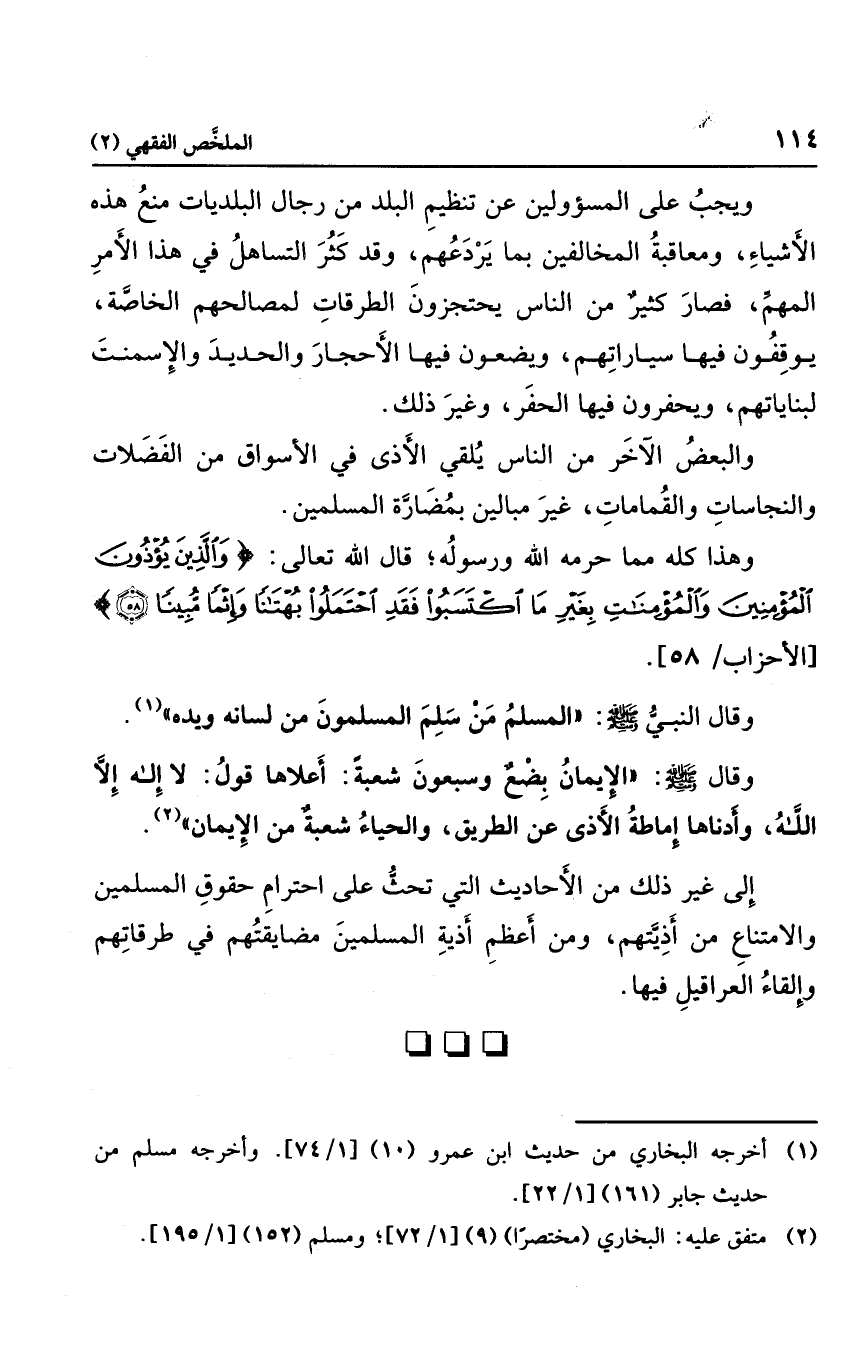 ويجب على المسئولين عن تنظيم البلد من رجال البلديات منع هذه الأشياء ومعاقبة المخالفين بما يردعهم، وقد كثر التساهل في هذا الأمر المهم، فصار كثير من الناس يحتجزون الطرقات لمصالحهم الخاصة، يوقفون فيه سياراتهم، ويضعون فيها الأحجار والحديد والإسمنت لبناياتهم، ويحفرون فيها الحفر، وغير ذلك، والبعض الآخر من الناس يلقي الأذى في الأسواق من الفضلات والنجاسات والقمامات، غير مبالين بمضارة المسلمين، وهذا كله مما حرمه الله ورسوله، قال الله تعالى: {وَالَّذِينَ يُؤْذُونَ الْمُؤْمِنِينَ وَالْمُؤْمِنَاتِ بِغَيْرِ مَا اكْتَسَبُوا فَقَدِ احْتَمَلُوا بُهْتَاناً وَإِثْماً مُبِيناً} ، وقال النبي صلى الله عليه وسلم: "المسلم من سلم المسلمون من لسانه ويده"، وقال صلى الله عليه وسلم: "الإيمان بضع وسبعون شعبة: أعلاها قول: لا إله إلا الله، وأدناها إماطة الأذى عن الطريق، والحياء شعبة من الإيمان".... إلى غير ذلك من الأحاديث التي تحث على احترام حقوق المسلمين والامتناع من أذيتهم، ومن أعظم أذية المسلمين مضايقتهم في طرقاتهم وإلقاء العراقيل فيها.