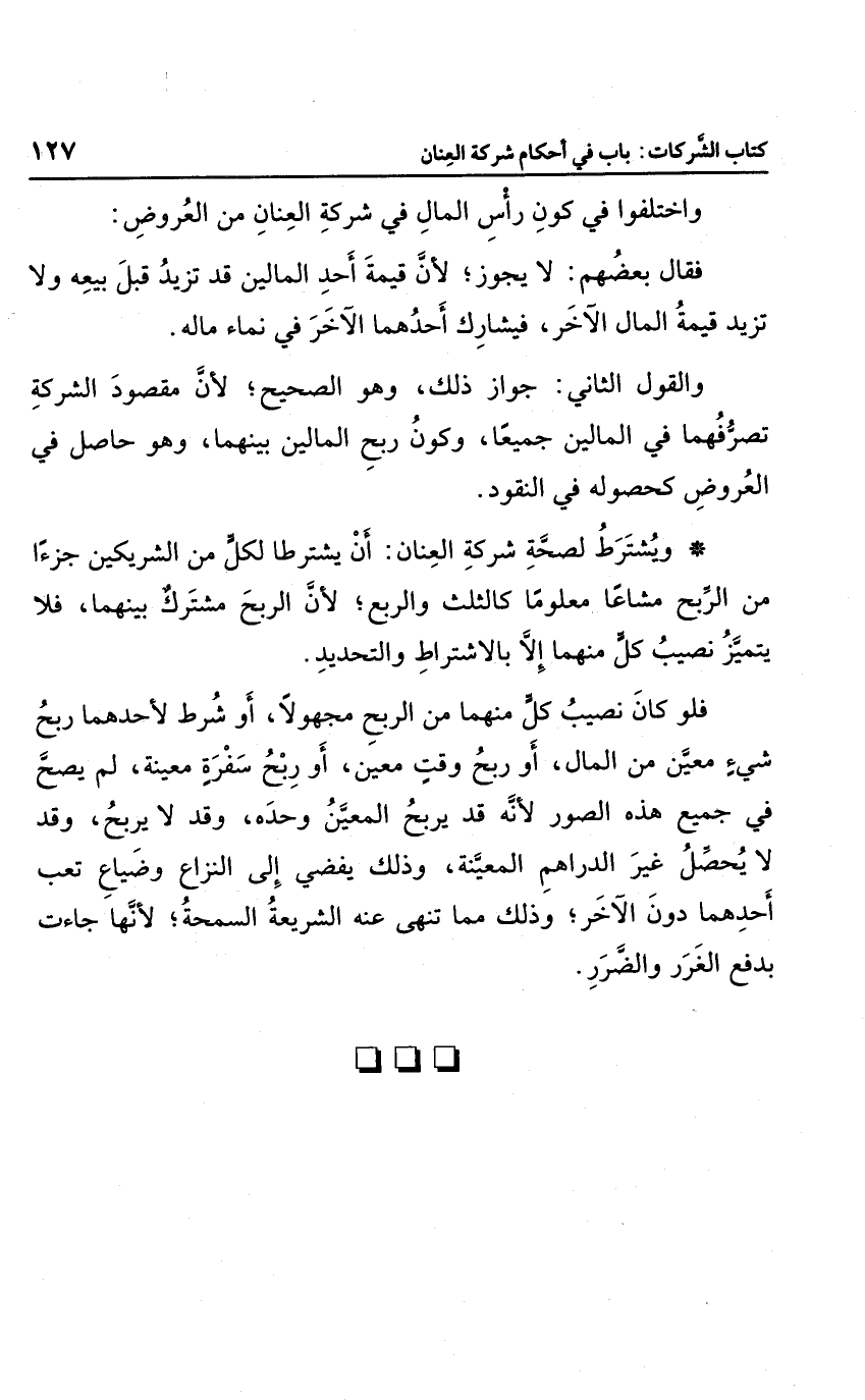 واختلفوا في كون رأس المال في شركة العنان من العروض، فقال بعضهم: لا يجوز؛ لأن قيمة أحد المالين قد تزيد قبل بيعه ولا تزيد قيمة المال الآخر، فيشارك أحدهما الآخر في نماء ماله. والقول الثاني جواز ذلك، وهو الصحيح؛ لأن مقصود الشركة تصرفهما في المالين جميعا، وكون ربح المالين بينهما، وهو حاصل في العروض كحصوله في النقود.