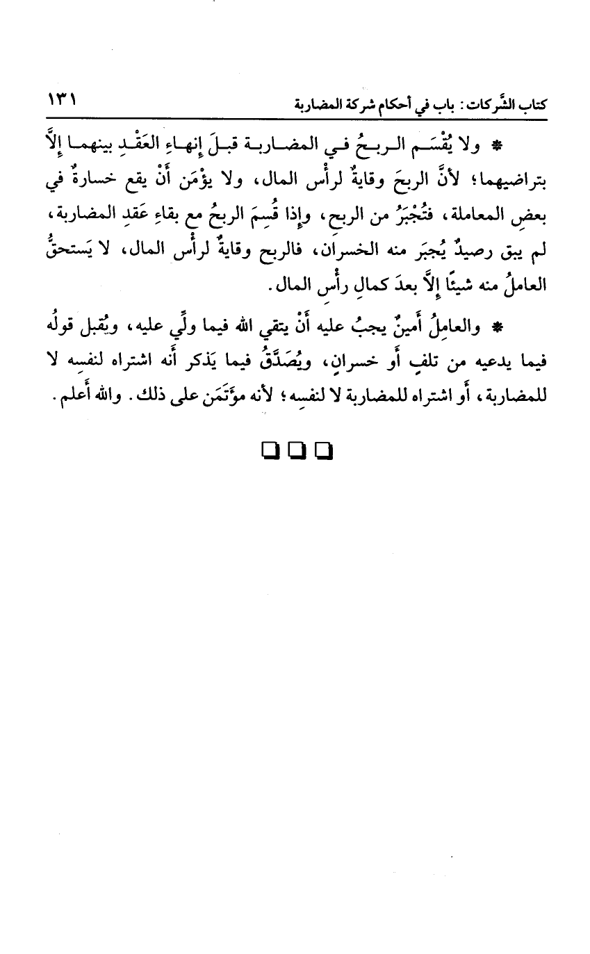 والعامل أمين يجب عليه أن يتقي الله فيما ولي عليه، ويُقبل قوله فيما يدعيه من تلف أو خسران، ويصدَّق فيما يذكر أنه اشتراه لنفسه لا للمضاربة أو اشتراه للمضاربة لا لنفسه؛ لأنه مؤتمن على ذلك، والله أعلم.