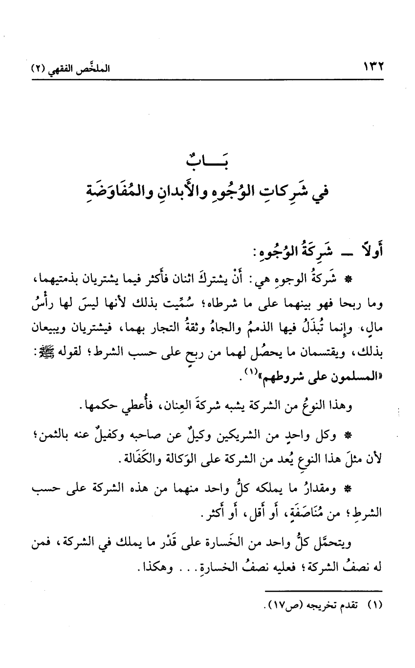 شركة الوجوه هي: أن يشترك اثنان فأكثر فيما يشتريان بذمتيهما، وما ربحا فهو بينهما على ما شرطاه، سميت بذلك لأنها ليس لها رأس مال، وإنما تبذل فيها الذمم والجاه وثقة التجار بهما، فيشتريان ويبيعان بذلك، ويقتسمان ما يحصل لهما من ربح على حسب الشرط لقوله صلى الله عليه وسلم: "المسلمون على شروطهم".