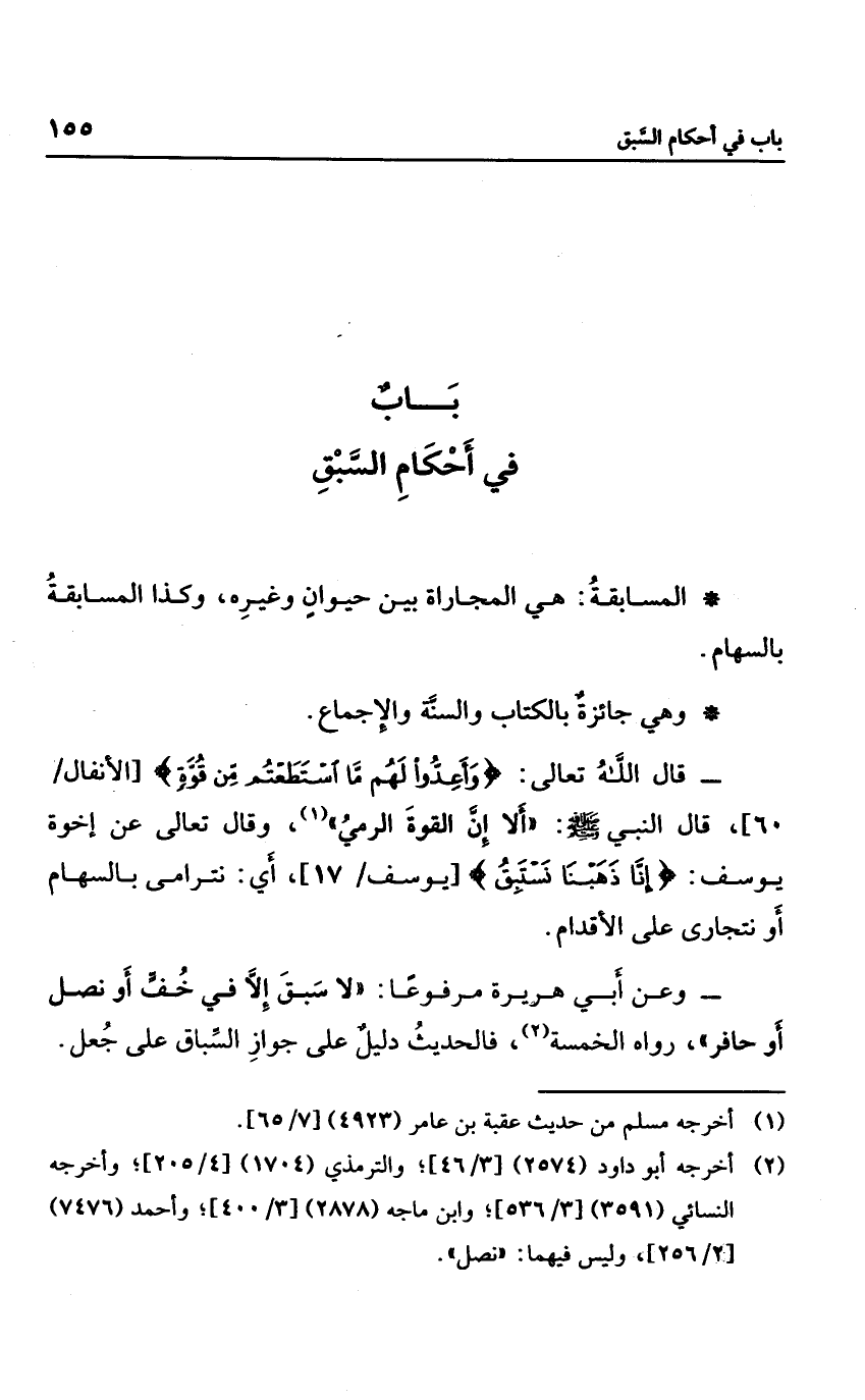 قال الله تعالى: {وَأَعِدُّوا لَهُمْ مَا اسْتَطَعْتُمْ مِنْ قُوَّةٍ} ، قال النبي صلى الله عليه وسلم: "ألا إن القوة الرمي"، وقال تعالى: {إِنَّا ذَهَبْنَا نَسْتَبِق} ؛ أي: نترامى بالسهام، أو نتجارى على الأقدام.