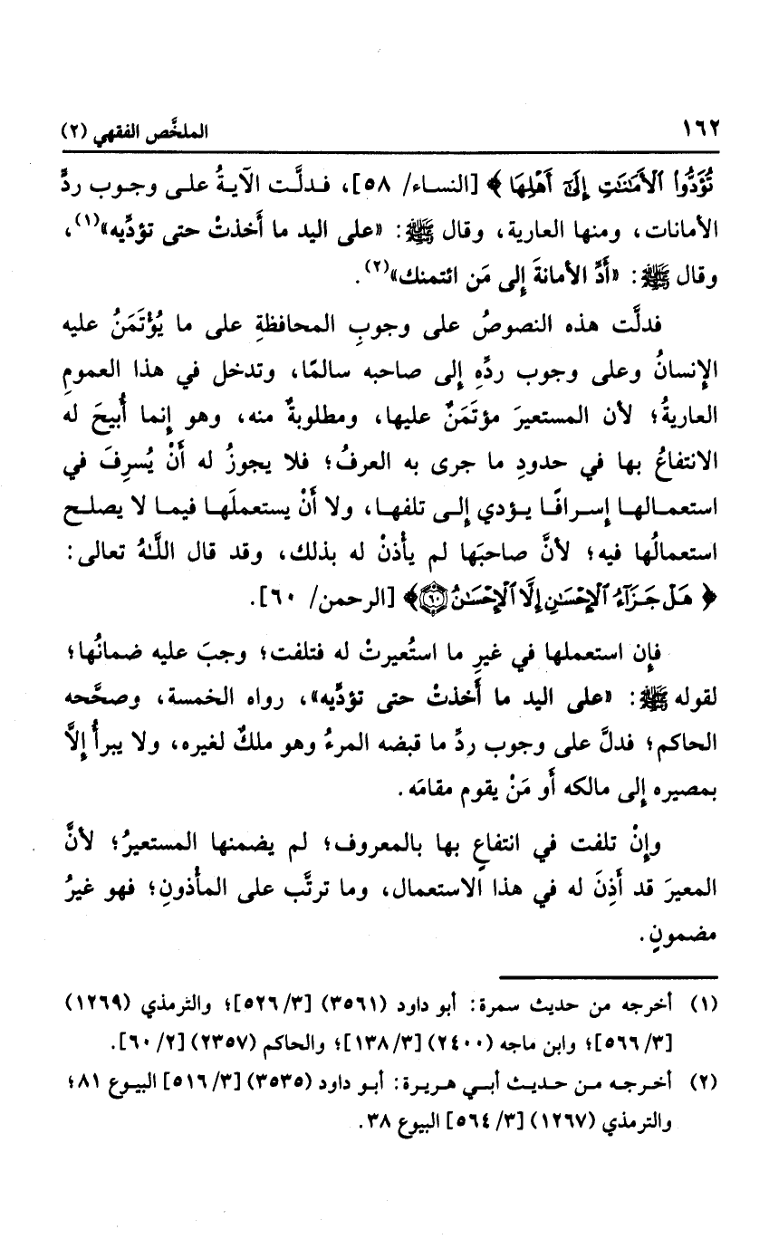 فدلت هذه النصوص على وجوب المحافظة على ما يؤتمن عليه الإنسان، وعلى وجوب رده إلى صاحبه سالما، وتدخل في هذا العموم العارية؛ لأن المستعير مؤتمن عليها، ومطلوبة منه، وهو إنما أبيح له الانتفاع بها في حدود ما جرى به العرف؛ فلا يجوز له أن يسرف في استمالها إسرافا يؤدي إلى تلفها، ولا أن يستعملها فيما لا يصلح استعمالها فيه؛ لأن صاحبها لم يأذن له بذلك، وقد قال الله تعالى: {هَلْ جَزَاءُ الأِحْسَانِ إِلاَّ الأِحْسَانُ} .