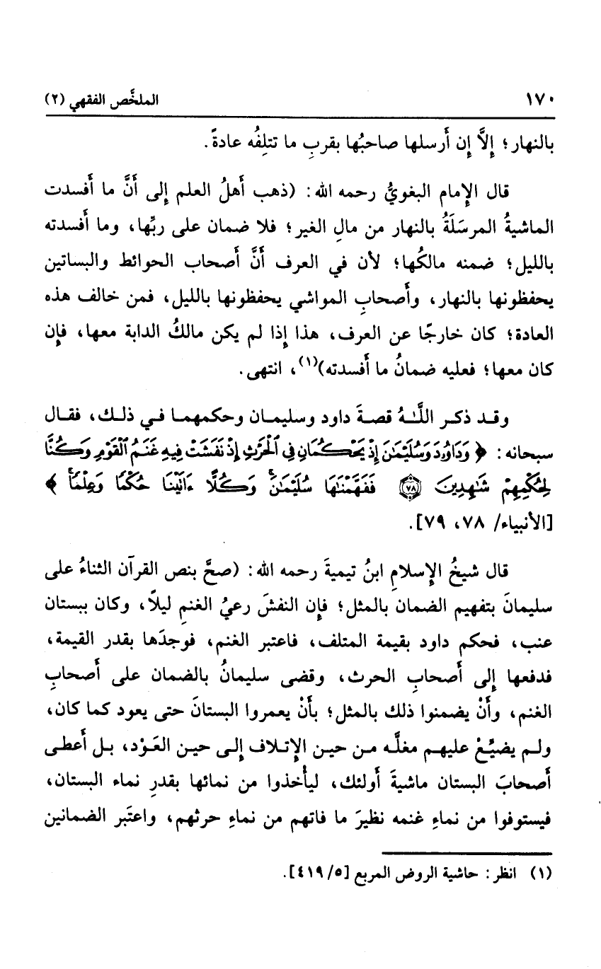 وقد ذكر الله قصة داود وسليمان وحكمهما في ذلك، فقال سبحانه: {وَدَاوُدَ وَسُلَيْمَانَ إِذْ يَحْكُمَانِ فِي الْحَرْثِ إِذْ نَفَشَتْ فِيهِ غَنَمُ الْقَوْمِ وَكُنَّا لِحُكْمِهِمْ شَاهِدِينَ فَفَهَّمْنَاهَا سُلَيْمَانَ وَكُلّاً آتَيْنَا حُكْماً وَعِلْما} .