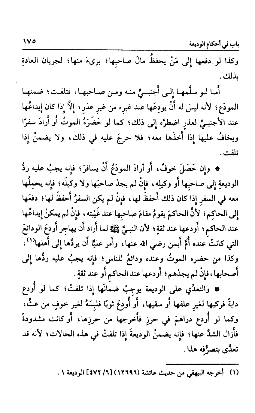 وإن حصل خوف، أو أراد المودَع أن يسافر؛ فإنه يجب عليه رد الوديعة إلى صاحبها أو وكيله، فإن لم يجد صاحبها ولا وكيله؛ فإنه يحملها معه في السفر إذا كان ذلك أحفظ لها، فإن لم يكن السفر أحفظ لها؛ دفعها إلى الحاكم؛ لأن الحاكم يقوم مقام صاحبها عند غيبته، فإن لم يكن إيداعها عند الحاكم؛ أودعها ثقة؛ لأن النبي صلى الله عليه وسلم لما أراد أن يهاجر؛ أودع الودائع التي كانت عنده لأم أيمن رضي الله عنها، وأمر عليا أن يردها إلى أهلها، وكذا من حضرة الموت وعنده ودائع للناس؛ فإنه يجب عليه ردها إلى أصحابها، فإن لم يجدهم؛ أودعها عند الحاكم أو عند ثقة.