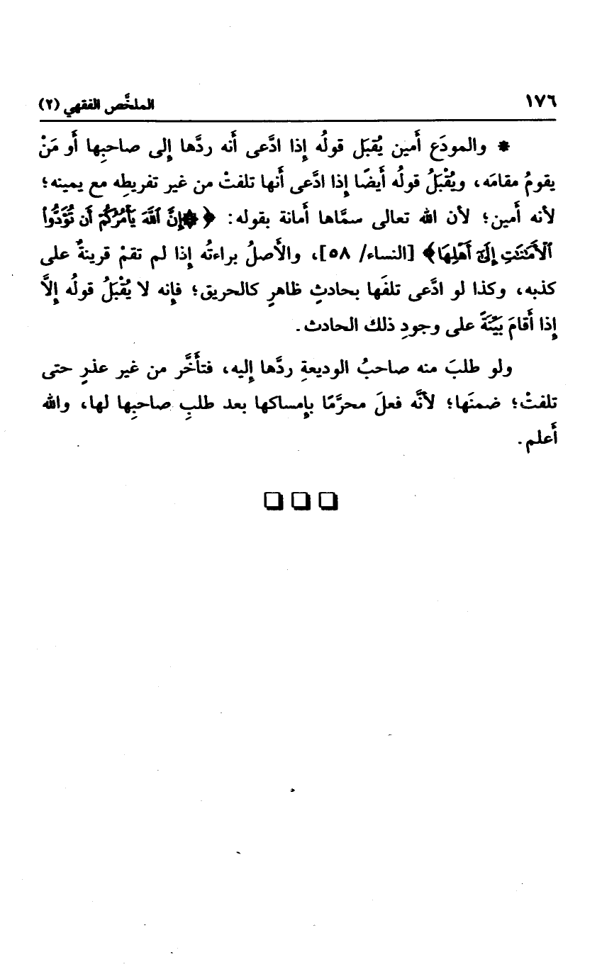 والمودَع أمين يُقبل قوله إذا ادَّعى أنه ردها صاحبها أو من يقوم مقامه، ويقبل قوله أيضا إذا ادَّعى أنها تلفت من غير تفريطه مع يمينه؛ لأنه أمين؛ لأن الله تعالى: سماها أمانة بقوله: {إِنَّ اللَّهَ يَأْمُرُكُمْ أَنْ تُؤَدُّوا الأَمَانَاتِ} ، والأصل براءته إذا لم تقم قرينة على كذبه، وكذا لو ادَّعى تلفها بحادث ظاهر كالحريق؛ فإنه لا يقبل قوله إلا إذا أقام بينة على وجود ذلك الحادث.